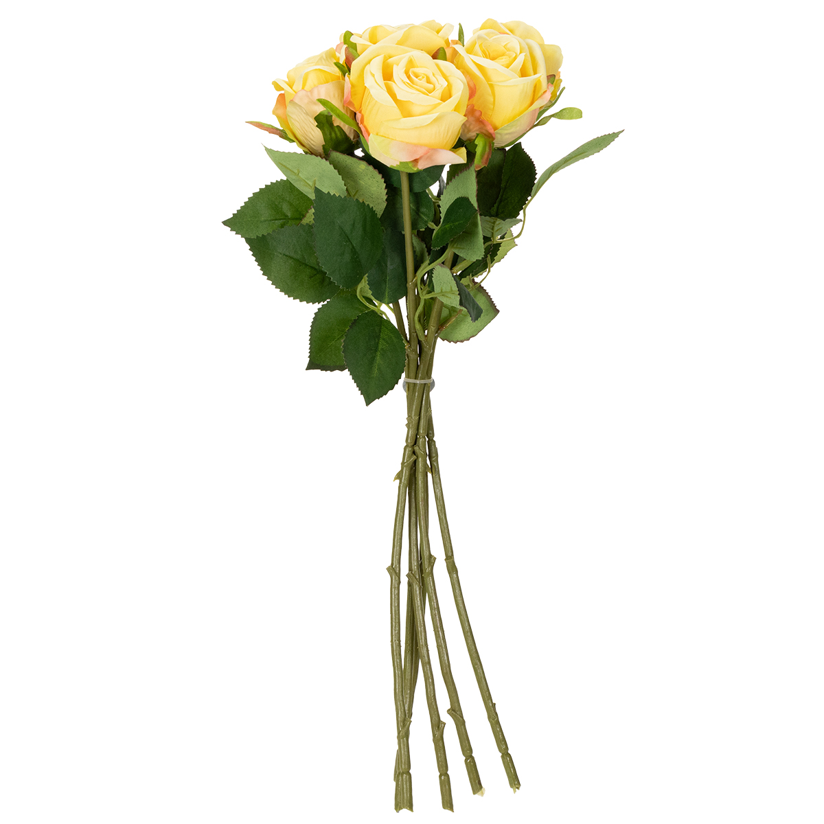 Questa composizione floreale di sei magnifiche rose gialle colpisce per la sua meticolosa lavorazione e versatilità. I fiori in poliestere di alta qualità appaiono incredibilmente realistici, mentre le foglie e gli steli ne esaltano ulteriormente l'aspetto realistico. Con una lunghezza di 44 cm, il bouquet è ideale per vasi di medie dimensioni, creando un effetto armonioso e naturale. Il giallo brillante delle rose emana calore e gioia di vivere, rendendolo perfetto per ambienti in stile moderno, classico o persino mediterraneo.