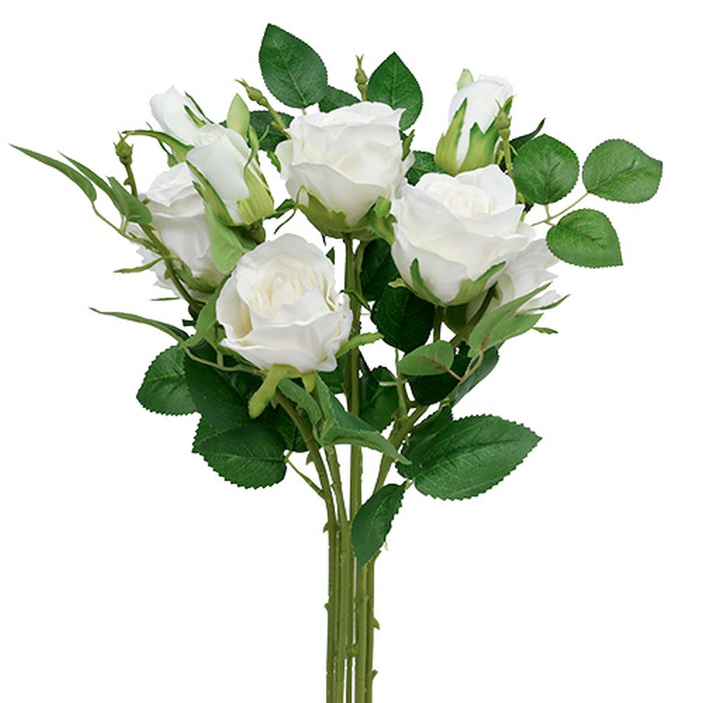 Der künstliche Rosenstrauß in Weiß hat eine Gesamtlänge von etwa 46 Zentimetern, während der Blütendurchmesser zwischen 3 und 6 Zentimeter beträgt.
