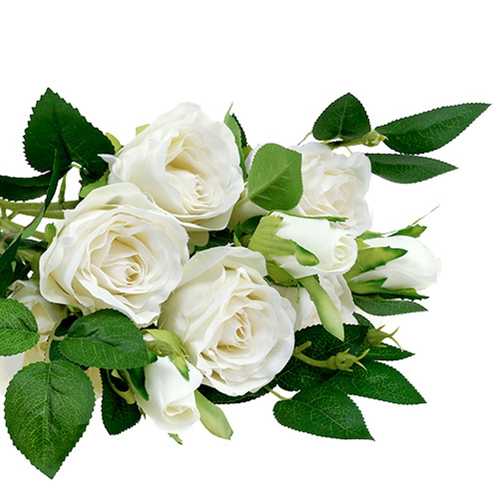 C’est le must pour chaque décoration de mariage romantique ! Le bouquet de roses en blanc de la marque populaire VIANA a l’air tellement naturel que vous pouvez presque sentir son parfum ! Vous pouvez placer les roses blanches dans une vase ou sur une nappe rouge et les entourer avec un collier de perles et des petits cœurs en bois ou en matière plastique. Le bouquet de roses artificielles fera aussi bonne figure sur la table à manger si vous planifiez un rendez-vous avec votre chéri.La rose, reine de tous les catalogues spécialistes de la décoration artificielle, embellira vos bureaux ou votre maison et apportera une touche d’été toute l'année pour égayer votre espace intérieur. Le bouquet est parfait pour agrémenter votre salle de séjour sans en être besoin de l’eau. Mettez le bouquet sur une commode, un rebord de fenêtre ou bien la réception d’hôtel. Il sera l’accroche-regard de chaque décoration !