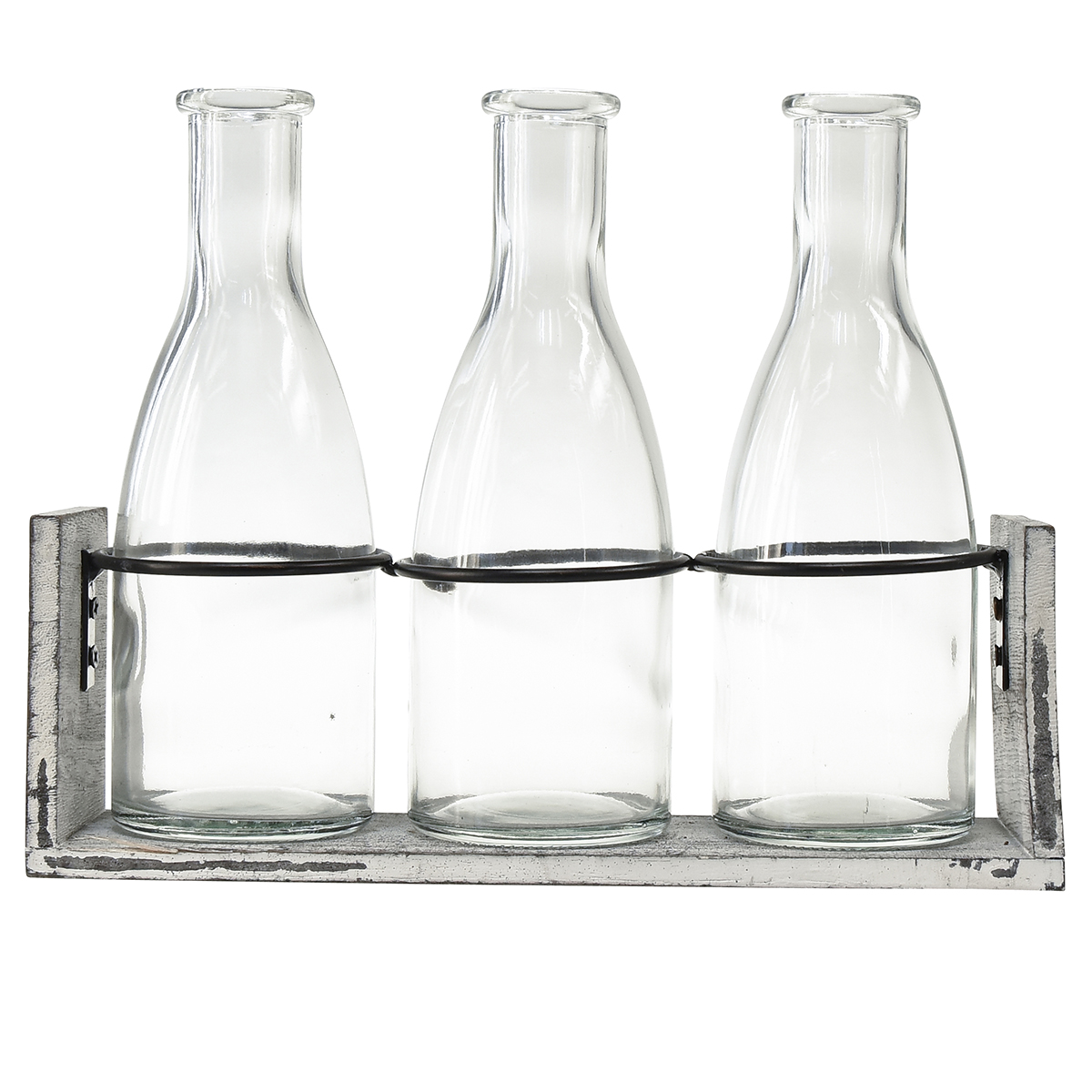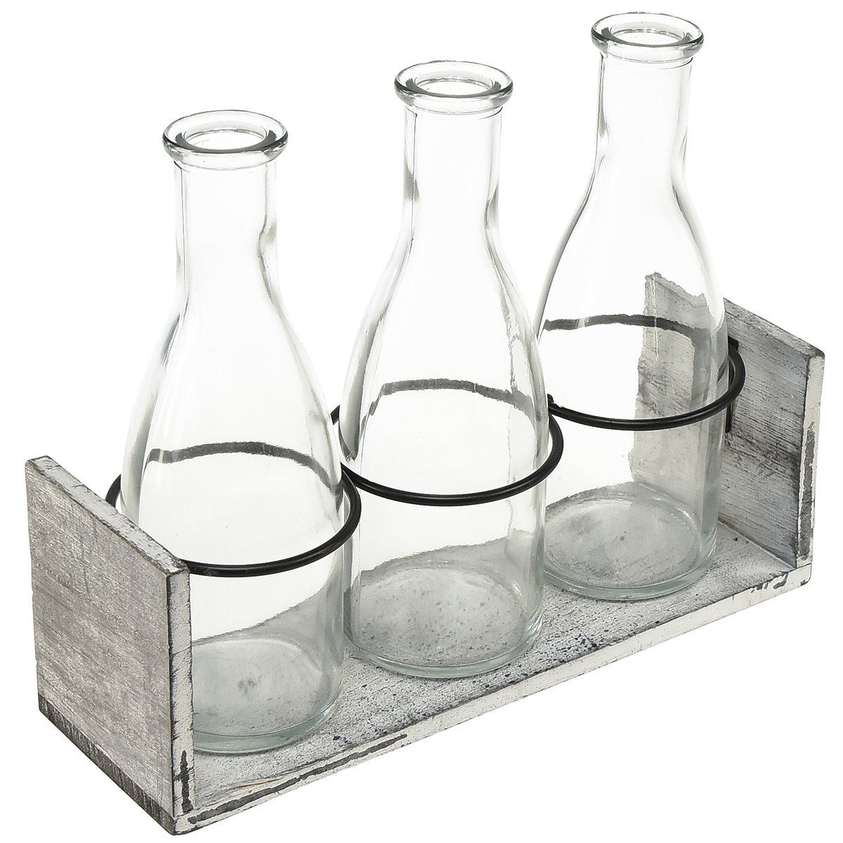 Ensemble de bouteilles rustiques dans un support en bois - 3 bouteilles en verre, gris-blanc, 24x8x20 cm - Polyvalent pour la décoration