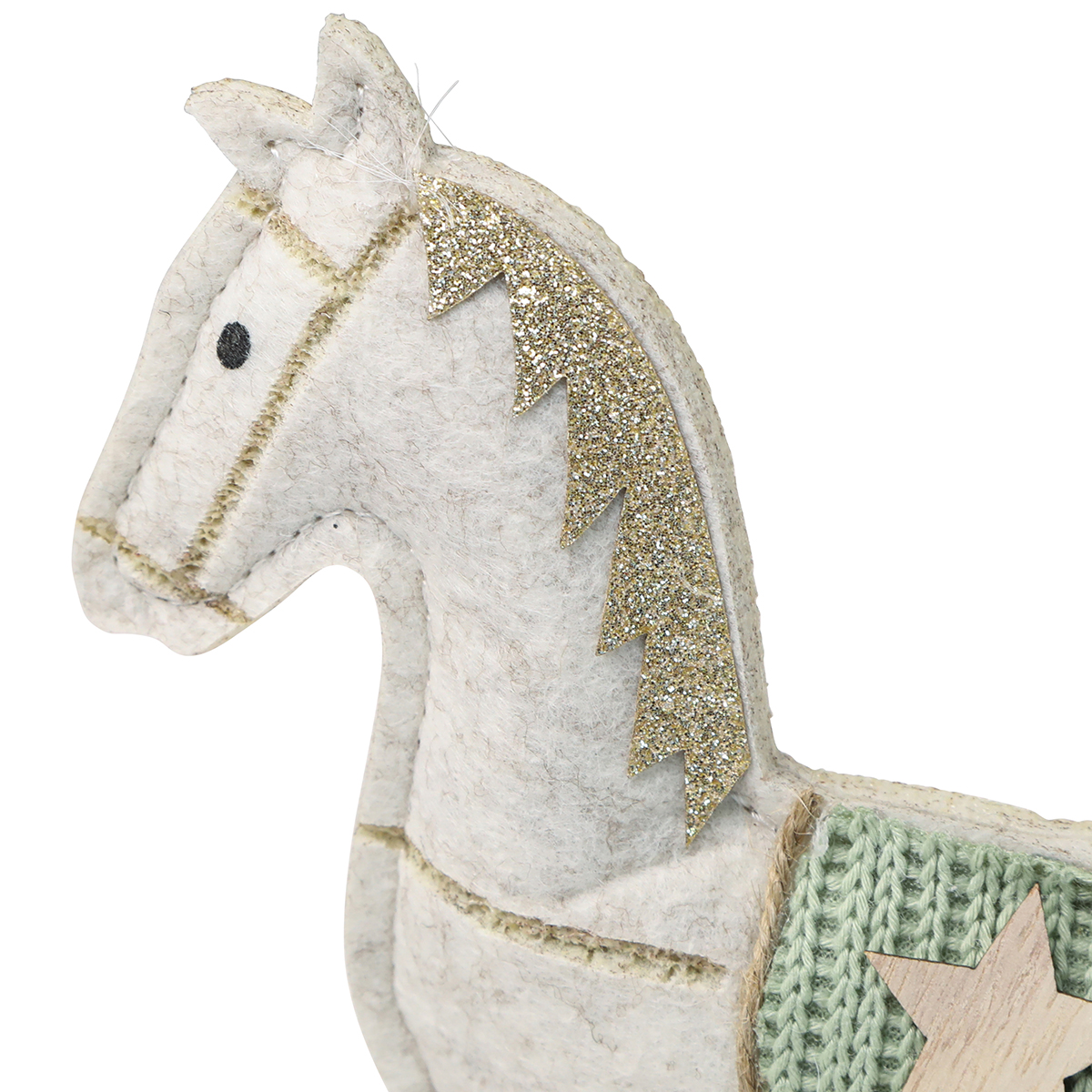 Dieses dekorative Schaukelpferd im cremefarbigen Filz mit goldenem Halfter und grünem Sattel mit Stern setzt nostalgische Akzente in Ihrer Weihnachtsdekoration. Die Filz-Deko ist einseitig verziert und steht sicher auf seinen Kufen aus Holz. Die Kufen verfügen über eine abgeflachte Stelle zum sicheren Aufstellen. Die goldene Mähne verleiht dem Schaukelpferd einen festlichen Glanz, während der mit flauschigen weißen Fasern versehene Schwanz, der grüne Sattel mit Stern und die schwarzen Augen liebevolle Details darstellen.