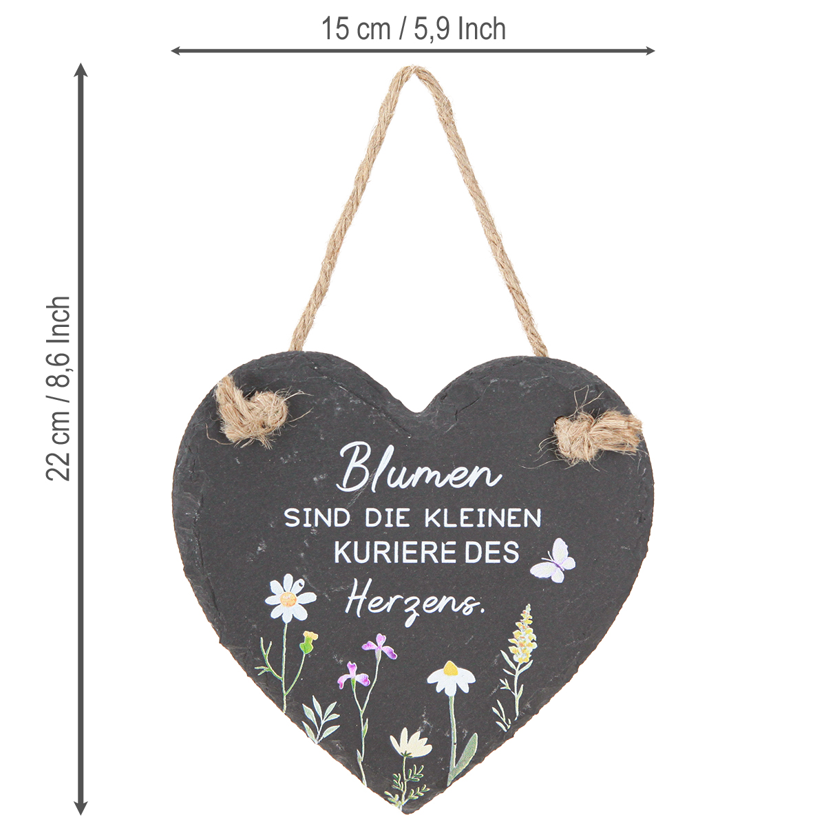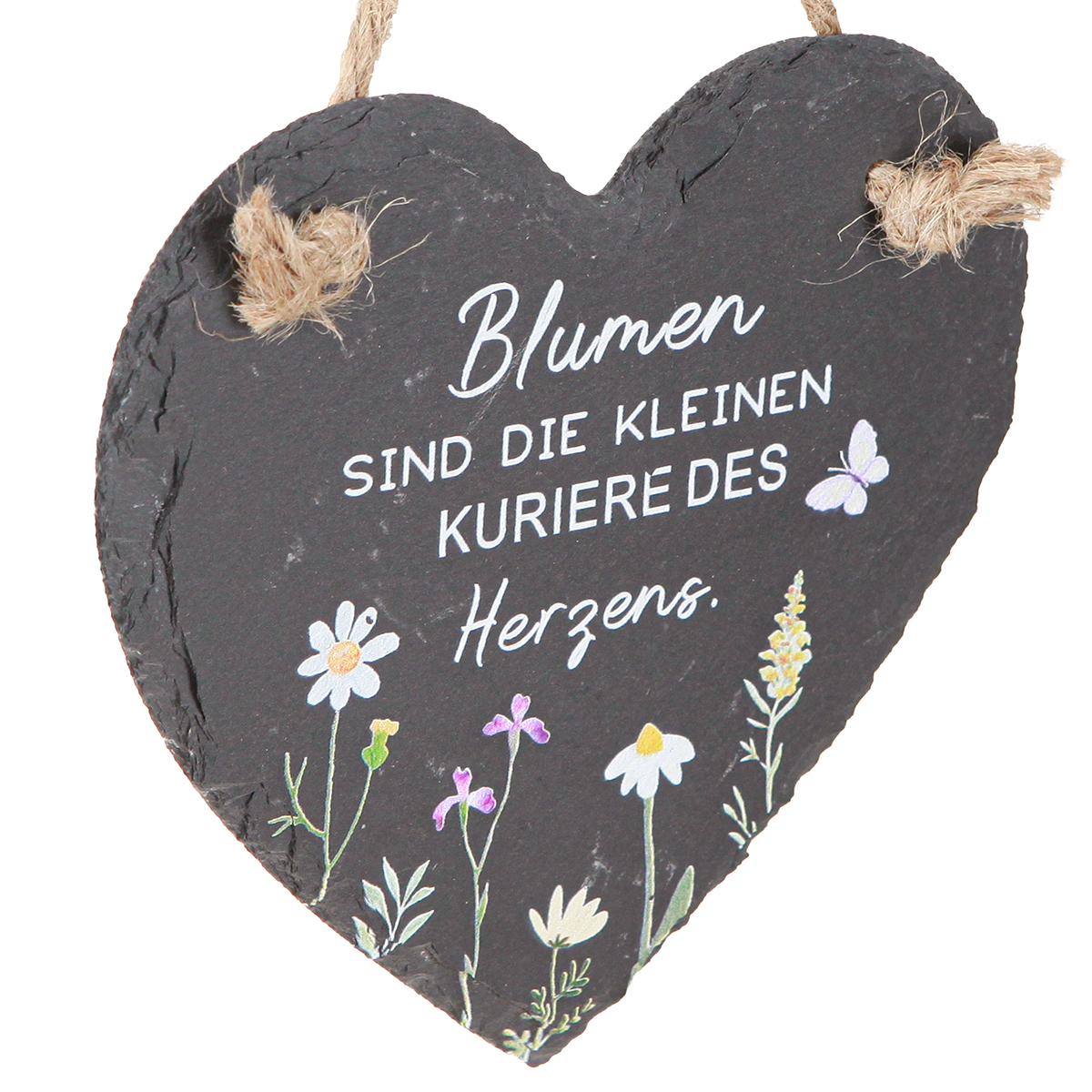 Dieses Deko-Herz aus Schiefer zum Hängen ist nicht nur eine einfache Dekoration, sondern ein inspirierendes Element, das Ihrem Zuhause im Handumdrehen eine persönliche Note verleiht. Mit dem eleganten schwarzen Schieferherz, das den weißen Spruch „Blumen sind die kleinen Kuriere des Herzens“ trägt, können Sie Ihren Räumen eine romantische und gleichzeitig stilvolle Atmosphäre verleihen. Das zarte Blumen- und Schmetterlingsmotiv in den Farben Rosa, Gelb und Weiß unterstreicht eine frühlingshafte Leichtigkeit, die sich ideal als Wanddeko oder als hängendes Herz in Ihrem Kranz macht. Schmücken Sie Ihre Raumgestaltung mit dieser herzlichen Dekoration, die dank der robusten Jutekordel einfach aufzuhängen ist. Zu drei Stück erhältlich, eignet sich das Schieferherz perfekt für Frühling und Sommer und verleiht Ihrem Zuhause oder Gartenfest einen frischen Touch. Ideal ist das Deko-Herz für den Landhausstil und klassische Dekorationen.