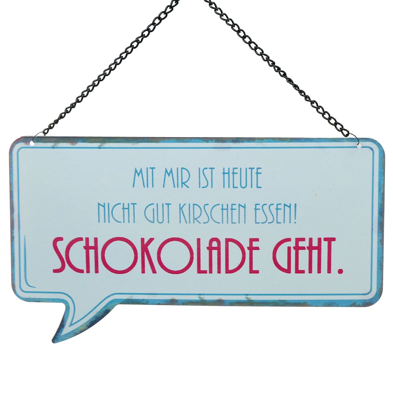 Das Schild zum Aufhängen mit einem frechen Spruch zum Thema „Kirschen und Schokolade“ besteht aus lackiertem Metall und hat etwa folgende Maße: 24 Zentimeter mal 13,5 Zentimeter. Dabei beträgt die Gesamtlänge mit Aufhänger circa 24 Zentimeter.