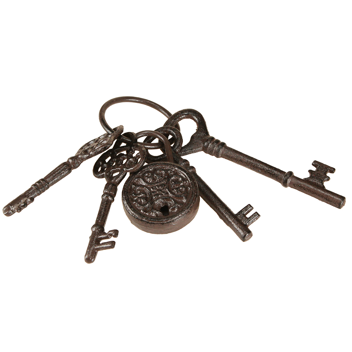 Verfeinern Sie Ihre Vintage-Deko mit diesem originellen Schlüsselbund am Metallring in Braun! Die einzelnen Schlüssel sowie der Ring bestehen bei dieser Hänge- oder auch Tischdeko aus Gusseisen. Die einzelnen Elemente sind in einem dunklen Braun bestrichen, das auch die griffige Patina auf der Oberfläche erzeugt. Damit wirken die Deko-Schlüssel und das Schloss wie künstlich gealtert, was durch die Vintage-Gestaltung der einzelnen Bärte noch untermauert wird.