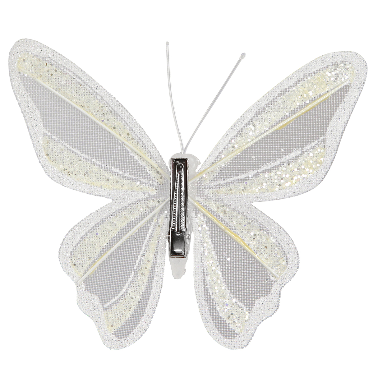 Die Schmetterlinge in Weiß haben eine Spannweite von circa 15 Zentimetern. Eine Packung enthält 2 Stück der vielseitig verwendbaren Deko-Tiere, sodass Sie gleich verschiedene Anwendungen ausprobieren können.