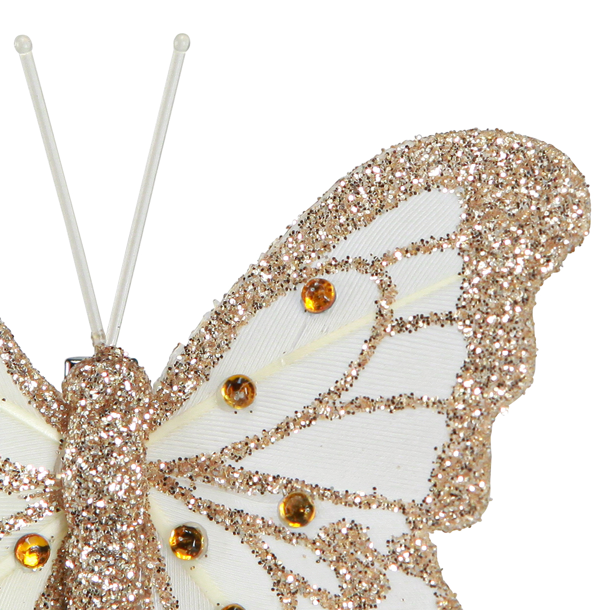 Die goldenen Federschmetterlinge weisen eine detailreiche Gestaltung auf, mit goldfarbenem Glitter und gelbgoldenen Perlen, was ein luxuriöses Flair erzeugt. Der Körper und die Fühler der Schmetterlinge sind aus einem farblos-milchigen Kunststoff, was den edlen Glanz der Flügel besonders betont. Diese Schmetterling-Deko ist ein hinreißendes Accessoire und fügt sich nahtlos in moderne sowie klassische Dekorationsstile ein.