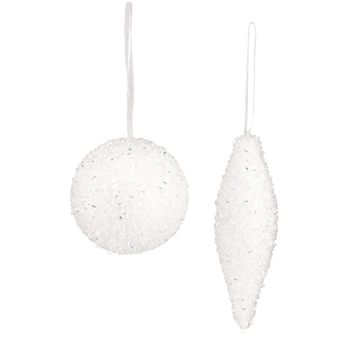 Gestalten Sie Ihren Weihnachtsbaum mit unserem hochwertigen Weihnachtsschmuck in Weiß. Die 6 Kugeln und 12 Zapfen mit einem Durchmesser von etwa 4 und 8 cm sind perfekt für den Christbaum und jede Art von Weihnachtsdeko. Die liebevoll gestalteten Schneekugeln und filigranen Eiszapfen aus weißem Kunststoff sind mit silbernen Fäden versehen.
