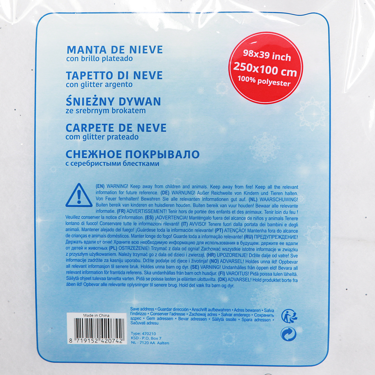 L'effet hivernal peut être encore amélioré en utilisant de la neige artificielle supplémentaire. Le tapis à neige à paillettes argentées mesure environ 250 centimètres × 100 centimètres et est composé à 100 % de polyester.