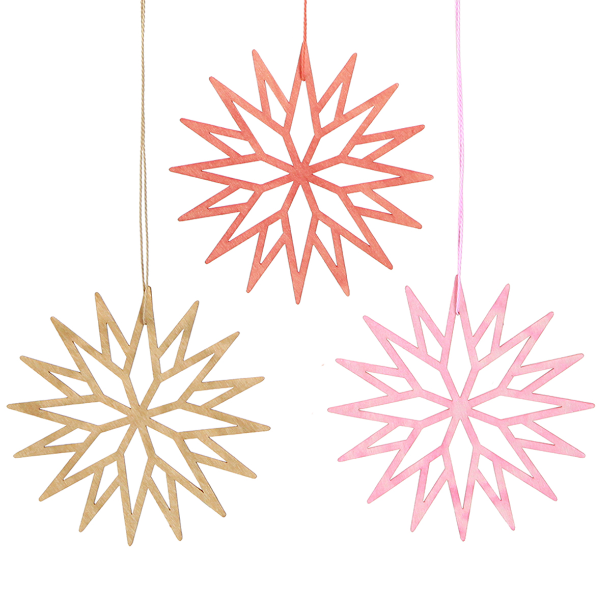 Die Schneeflocken sind mit farblich passenden Aufhängern versehen und bieten durch ihr charmantes und natürliches Design die perfekte Ergänzung für jede Weihnachtsdekoration. Gefertigt aus hochwertigem Holz, misst jede sternförmige Schneeflocke etwa 10 cm im Durchmesser und verleiht Ihrer Festdeko eine rustikale und dennoch moderne Note. Das warme Orange, das zarte Rosa und das Holz in Naturfarbe sind die ideale Kombination zu neutralen oder erdigen Farben, und passen perfekt in ein Boho-inspiriertes oder Skandi-Design. Ergänzen Sie diese Schneeflocken mit Kerzen und natürlichen Elementen wie Zapfen oder Zweigen für eine harmonische Weihnachtsumgebung.