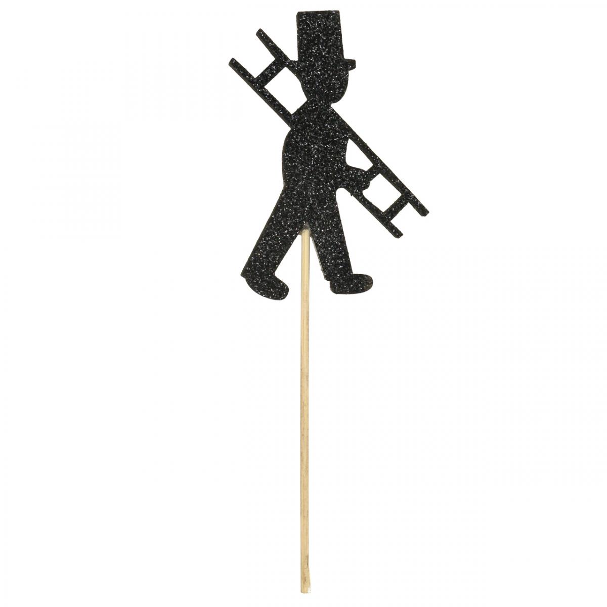 Die Silvesterdeko besteht aus 24 kleinen Kaminkehrern auf einem Holzstäbchen. Die Deko-Figuren haben die Silhouette eines Schornsteinfegers mit Zylinder, der eine Leiter trägt. Die Blumenstecker sind in einem edlen Schwarz mit Glitter gefärbt, welches ein leichtes Funkeln von sich gibt.