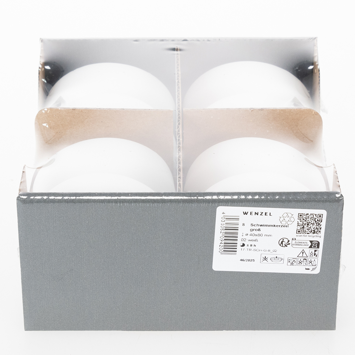 Geliefert werden die Schwimmkerzen aus weißem Wachs in einem Set zu insgesamt 8 Stück. Jede Kerze ist bei einem Durchmesser von circa 8 Zentimetern in etwa 4 Zentimeter hoch und besitzt eine Brenndauer von ungefähr 8 Stunden.