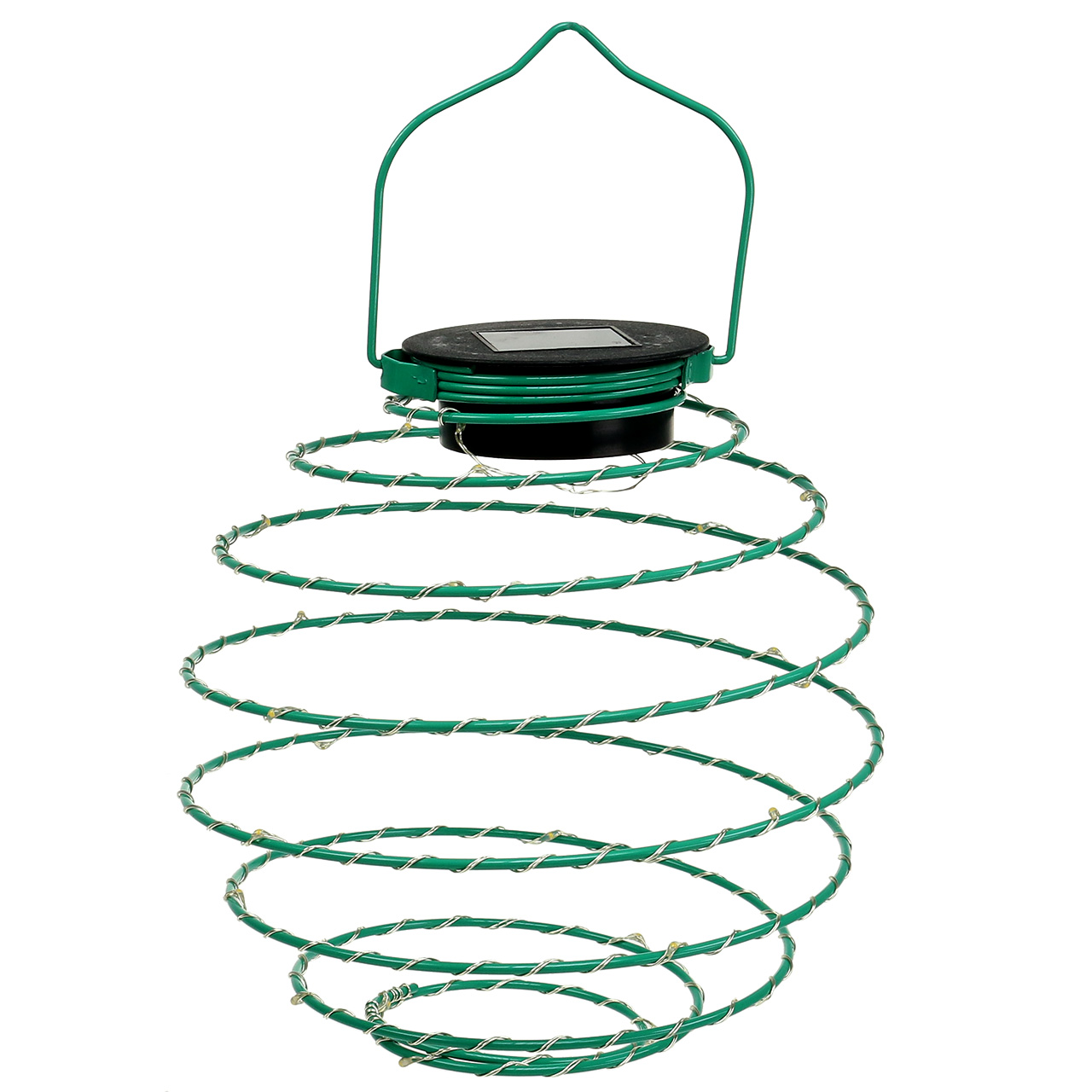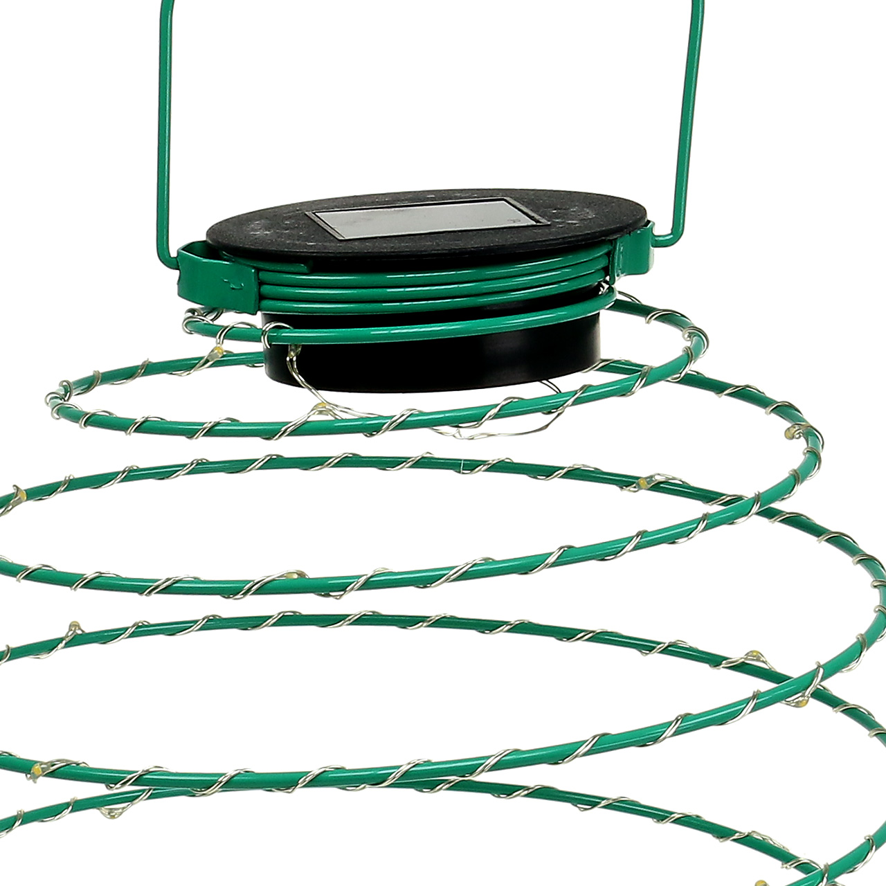Voilà une décoration flexible et très moderne pour votre jardin : une lampe solaire verte faite de 25 ampoules LED à éclairage blanc chaud et munie d’une anse de suspension sur le dessus ! L’ensemble est formé par un fil métallique façonné en spirale et enveloppé d’une guirlande à LED. Telle un lampion, votre boule pourra être pliée à plat et lorsqu’elle sera à nouveau déployée, elle affichera à nouveau sa forme de spirale qui la rend si intéressante. Sur la partie supérieure de la structure se trouve par ailleurs un petit panneau solaire qui peut être un peu retiré de son boîtier pour vous donner accès au bouton marche arrêt.Si la lampe a été suffisamment chargée, les ampoules vont s’illuminer à la tombée de la nuit et éclairer les alentours d’une douce lumière. Vous pourrez accrocher votre lampe solaire partout où il y a assez de place et ou il est possible de fixer un crochet. Vous aurez alors de quoi instaurer une belle ambiance lors d’une fête au jardin ou d’un soirée barbecue à l’extérieur et pourrez bien sûr également vous servir de votre lampe sur la terrasse ou le balcon pour animer une soirée entre amis ou tout simplement créer une ambiance de détente pour bien terminer votre journée.