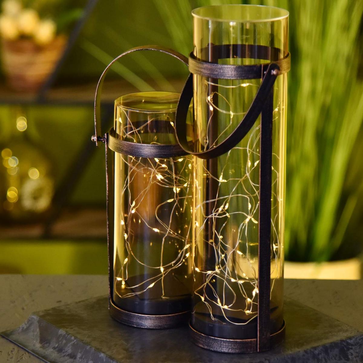 Mit dieser Solarleuchte können Sie nicht nur wunderbar Licht ins Dunkel Ihres Gartens bringen, zudem lädt die aus getöntem Acrylglas bestehende Lichtröhre zum Dekorieren ein. Als Gartenlaterne in ein Metallgestell in rustikalem Messing-Schwarz eingesetzt und mit 30 Micro-LEDs in Warmweiß beleuchtet kann die Solarlampe mit beweglichem Henkel getragen, aufgehängt oder gestellt werden.Im Boden der Gartenleuchte befindet sich ein Solarmodul, das nach genügend Sonnenlichteinstrahlung die LEDs der Drahtlichterkette im Inneren des Acryltubus zum Leuchten bringt. – So wirken die kleinen Lichtpunkte beinahe wie kleine Glühwürmchen, die in der Solar-Laterne umherfliegen und leuchten.