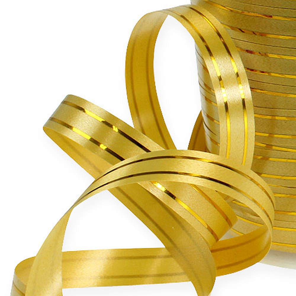 Notre ruban décoratif sur fond or mat orné de 2 bandes dorées brillantes atteint une largeur de 10 mm et a une longueur de 250 m environ. Il se compose à 100 % de polypropylène et est enroulé sur une bobine en plastique.