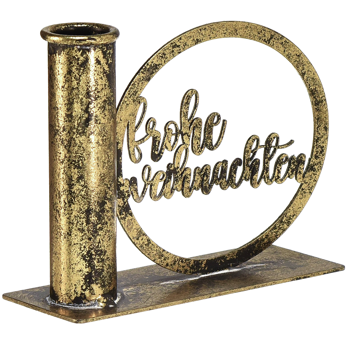 Entdecken Sie unseren Stabkerzenhalter für Weihnachten im edlen antik-golden Weihnachts-Design - eine stilvolle Ergänzung für Ihre Festtagsdekoration. Mit seinem stimmungsvollen Schriftzug „Frohe Weihnachten“ und der aufwändigen Antik-Optik mit schwarzen Akzenten sorgt dieser Kerzenständer in Gold mit seinem Antik-Look für eine warme, heimelige Atmosphäre in jedem Raum.
