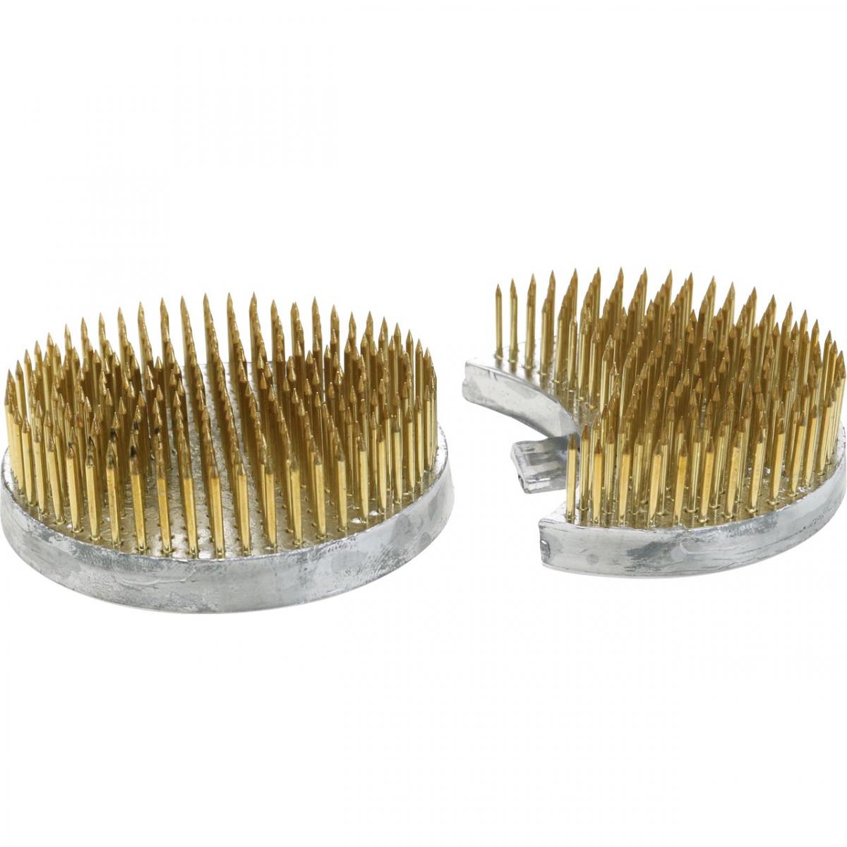 Holen Sie mit dem dekorativen Steckigel japanische Lebensart in Ihre vier Wände! Insgesamt 454 Metallnadeln aus Messing sind auf dem silbernen Stachelbett befestigt. An der Unterseite befindet sich zudem ein abnehmbarer Gummischoner. Sie können den Metall-Steckhalter zusammengesetzt verwenden oder Sie entnehmen den Kenzan in Rund und als Sichelmond einzeln für die Umsetzung Ihrer Dekoideen.