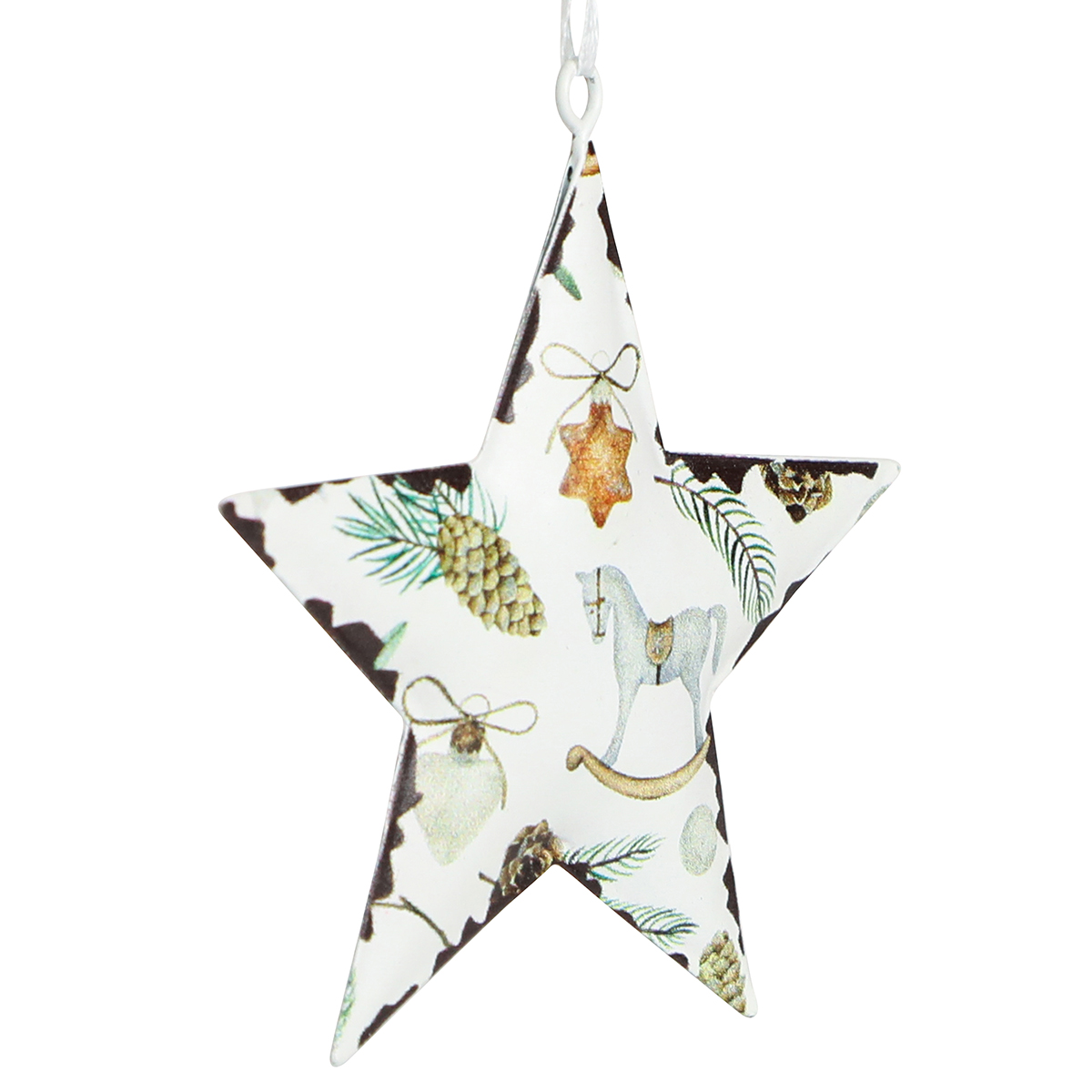 Ces pendentifs étoiles de haute qualité en métal d'un diamètre d'environ 8 cm sont présentés en trois versions différentes, chacune avec des motifs conçus avec amour. Choisissez entre le sapin de Noël vert classique avec des branches de conifères détaillées, le cheval à bascule nostalgique et le cerf élégant dans des tons marron naturels. Cette décoration étoilée s'intègre parfaitement dans n'importe quel style d'intérieur, du classique à la maison de campagne en passant par les intérieurs modernes.