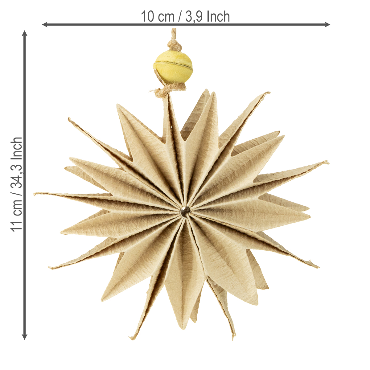 Diese Papiersterne in Naturbraun bieten schlichte Eleganz – perfekt für alle, die natürliche Materialien und ein entspanntes Ambiente lieben. Egal ob Fensterdekoration, Christbaumschmuck oder Türkranz – diese Sterne aus Papier sind vielseitig einsetzbar. Mit einem Durchmesser von etwa 10 cm und einer gelben Perle aus Styropor als charmantem Detail setzen die Aufhänger stilvolle Akzente.