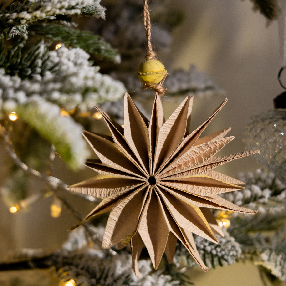 Unsere Papiersterne in Naturfarben sind nicht nur ein echter Hingucker, sondern auch unglaublich praktisch. Die zurückhaltende Farbgebung sorgt für eine warme, gemütliche Atmosphäre, ohne aufdringlich zu wirken. Die gelbe Styroporperle verleiht ihnen einen leichten Farbakzent, der besonders in Kombination mit Lichterketten oder anderen Naturmaterialien wie Holz oder Zapfen toll zur Geltung kommt. Sie können die Sterne vielseitig einsetzen: Hängen Sie sie an den Weihnachtsbaum, einen Türkranz oder dekorieren Sie damit Ihre Fenster. Besonders in Kombination mit weißen oder goldfarbenen Lichtern entfalten sie ihre volle Wirkung.