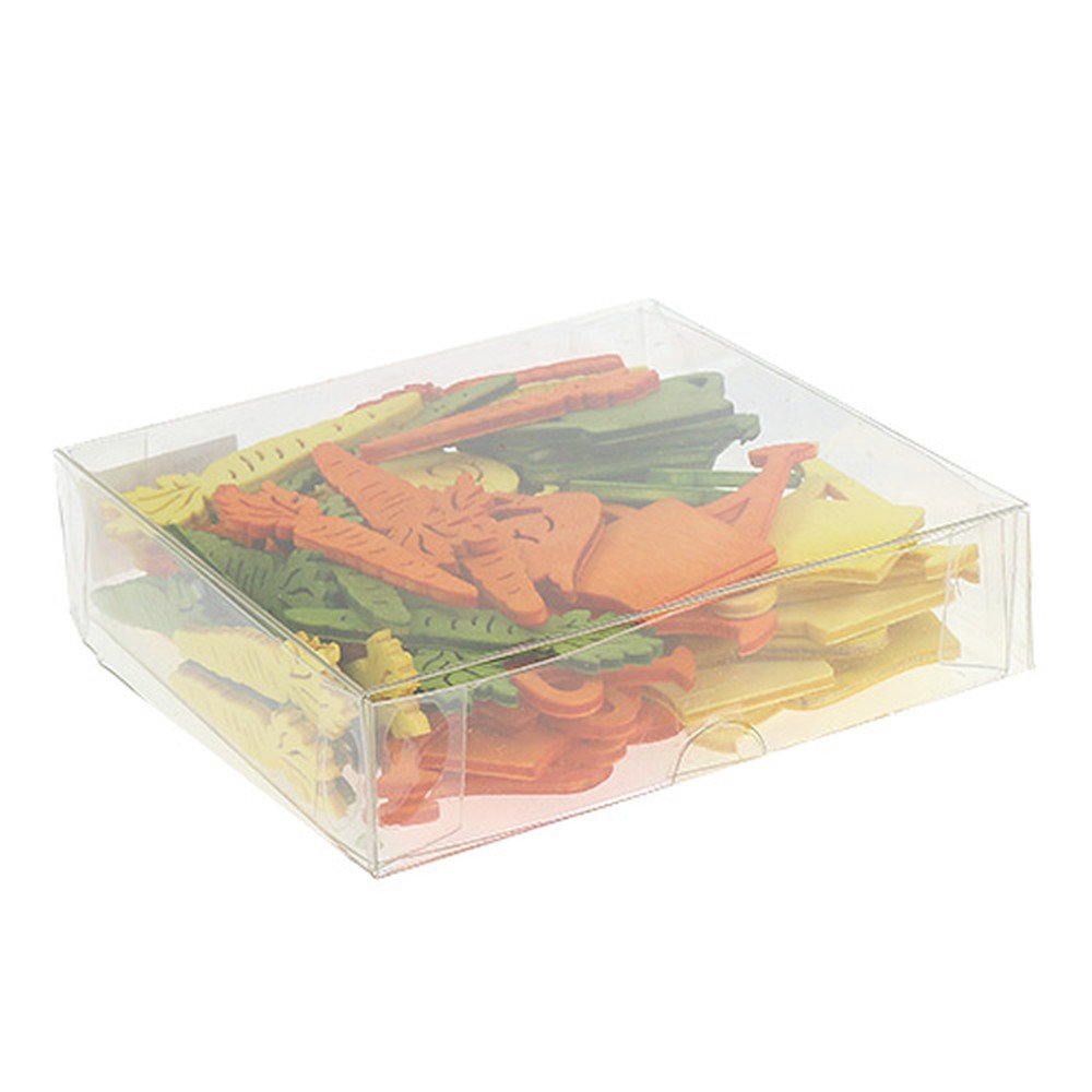 I decorazionida spargere in legno colorato con 3 motivi diversi sono forniti in una scatola di 72 pezzi. Ogni motivo è composto da 24 figure singole e queste sono ancora divise in 8 per colore. Le carote e gli annaffiatoi sono ciascuno lungo circa 6 centimetri, mentre le lumache sono lunghe circa 4,5 centimetri.