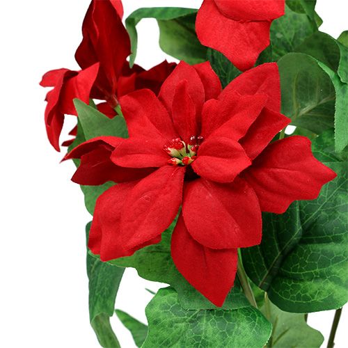 Der Weihnachtsstern im Tiefrot besteht aus neun hochwertigen grünen Kunststoffzweigen und ist circa 47cm lang. Die schönen Blütenköpfe sind im Durchmesser circa 10-12cm groß.