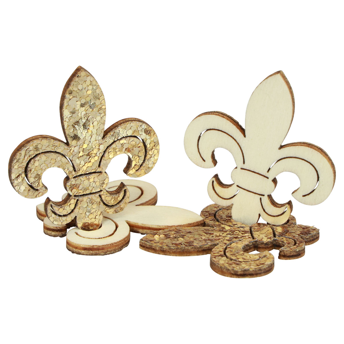 Questi pezzi sparsi sono ricoperti di glitter dorati sul davanti e di colore naturale sul retro. La forma del giglio è particolarmente bella e chiara sulla decorazione in legno grazie ai sottili ritagli.