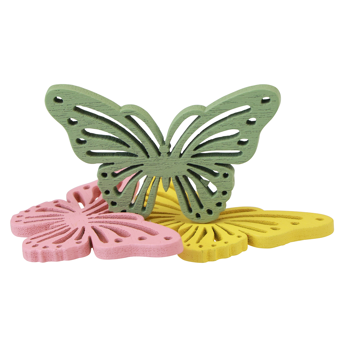 Da die Schmetterlinge filigran durchbrochen sind, wirkt die Streudeko nicht nur auf dem weißen Tischtuch, sondern auch auf der Fensterscheibe, auf farbigem Papier oder auf Holzmöbeln wunderschön. Mit etwas Heißkleber können Sie die Deko-Schmetterlinge deshalb wunderbar vielseitig zum Basteln einsetzen. Lassen Sie die Holzschmetterlinge doch bunt auf einem sommerlichen Türkranz flattern!