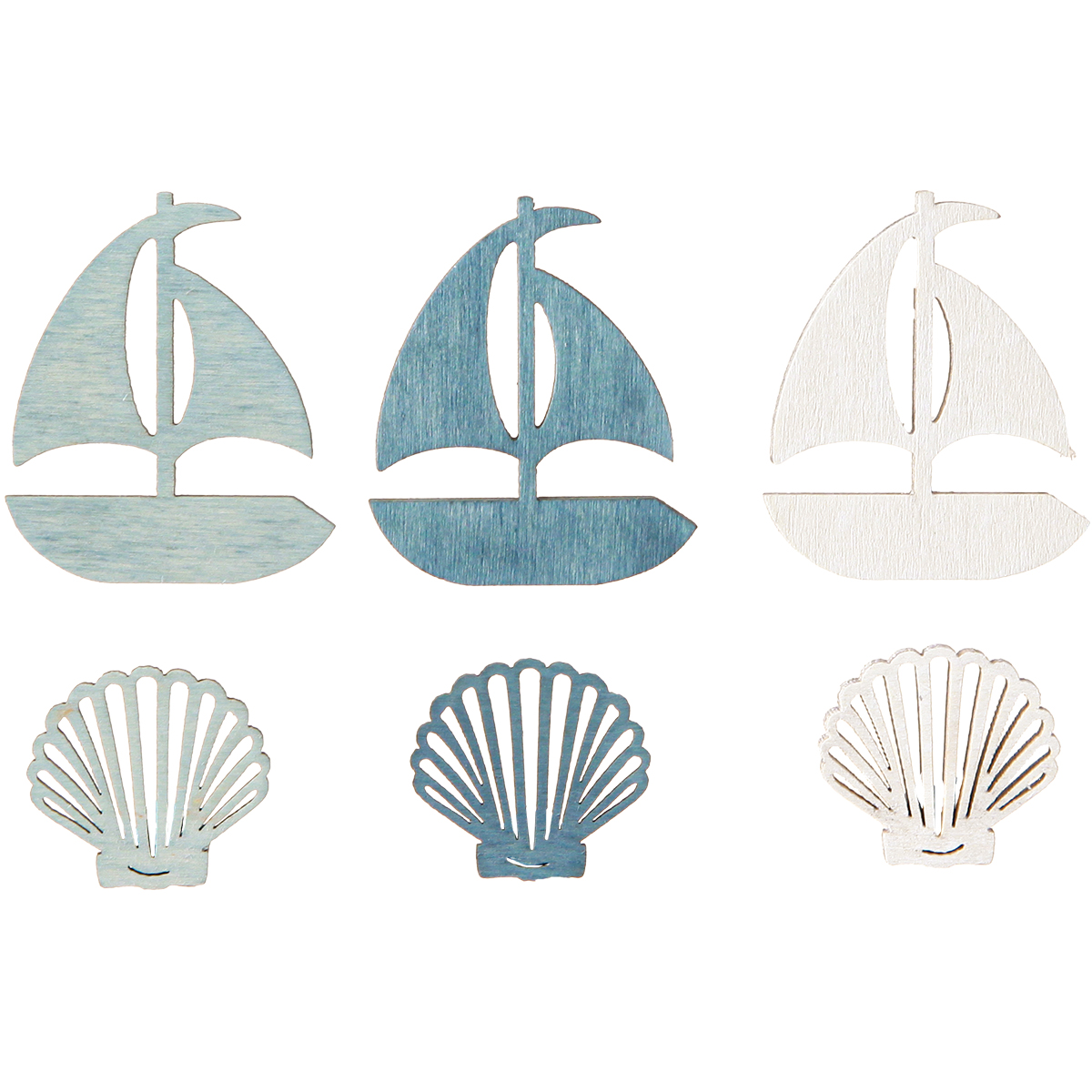 Streuteile Holz Deko Muschel Boot Blau Weiß 2,5/4cm 72 St
