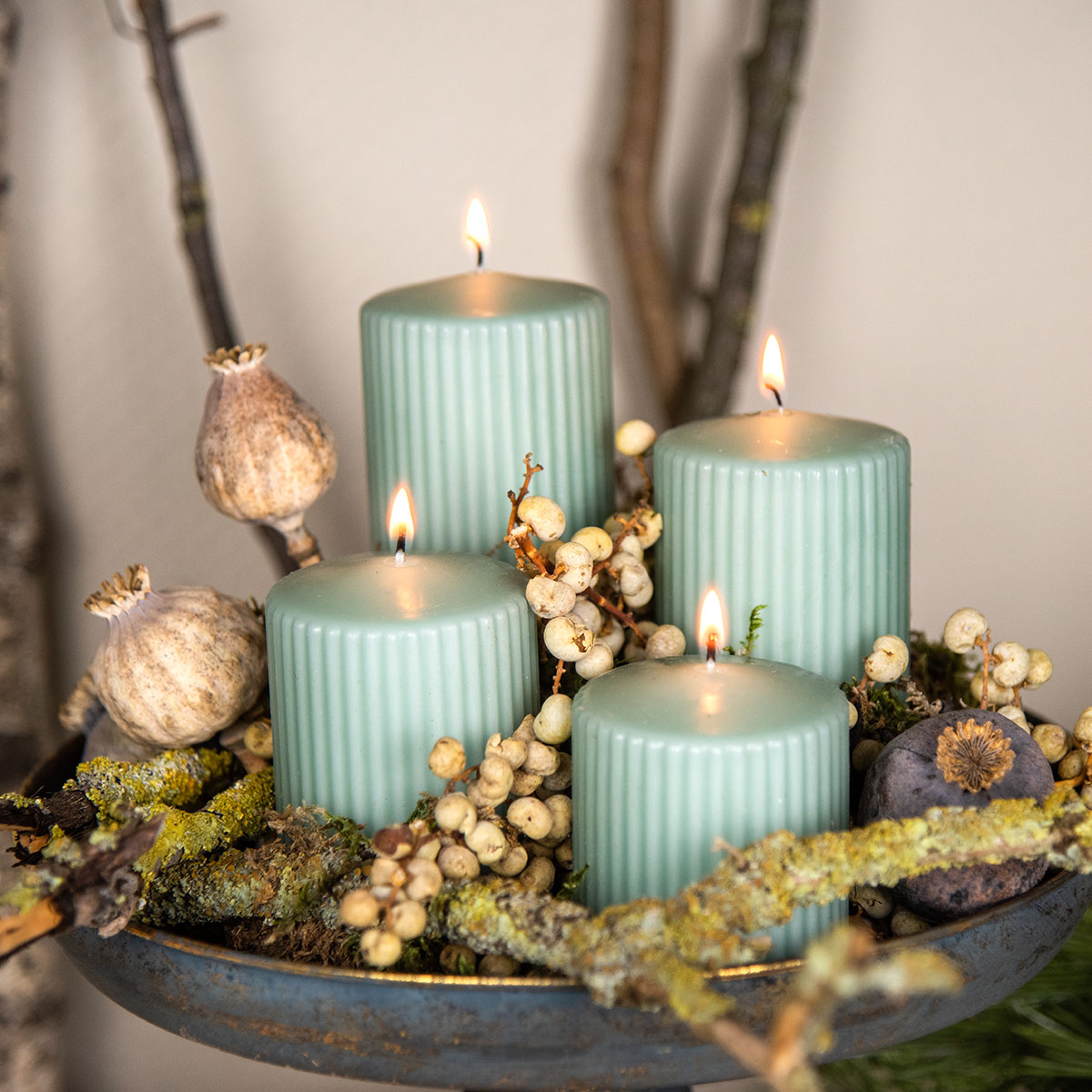 Das kühle Smaragdgrün harmoniert mit vielen originellen Deko-Ideen. Ob Sie die Rillenkerzen mit weißen, goldenen, hellblauen oder schwarzen Accessoires kombinieren, diese Stumpenkerzen strahlen stets Eleganz aus.