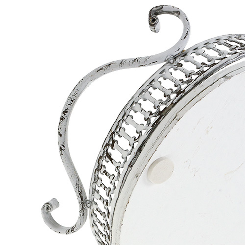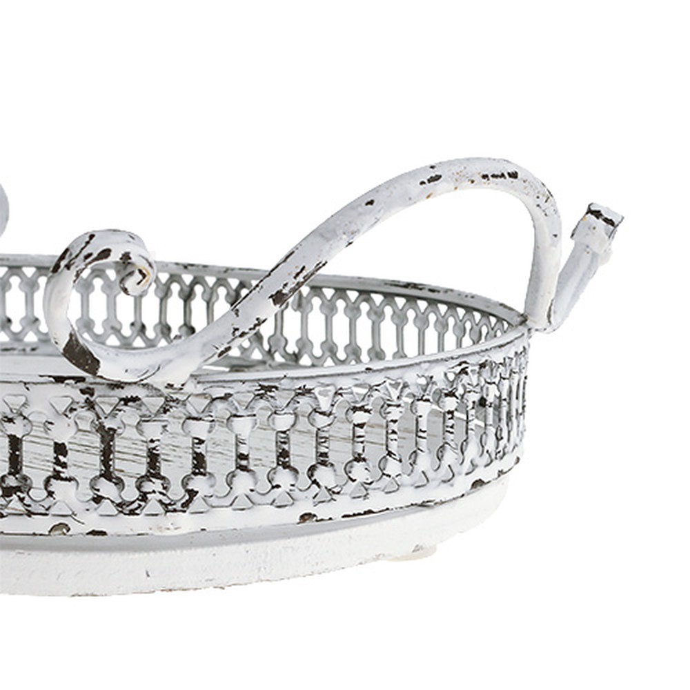 Il vassoio ovale ha una base in legno e una cornice con manici in metallo. Entrambi i materiali sono bianchi per un effetto di invecchiamento artificiale. Il vassoio è lungo circa 23 centimetri, largo circa 17,5 centimetri e include le maniglie alte circa 7,5 centimetri, senza maniglie 4,5 centimetri.