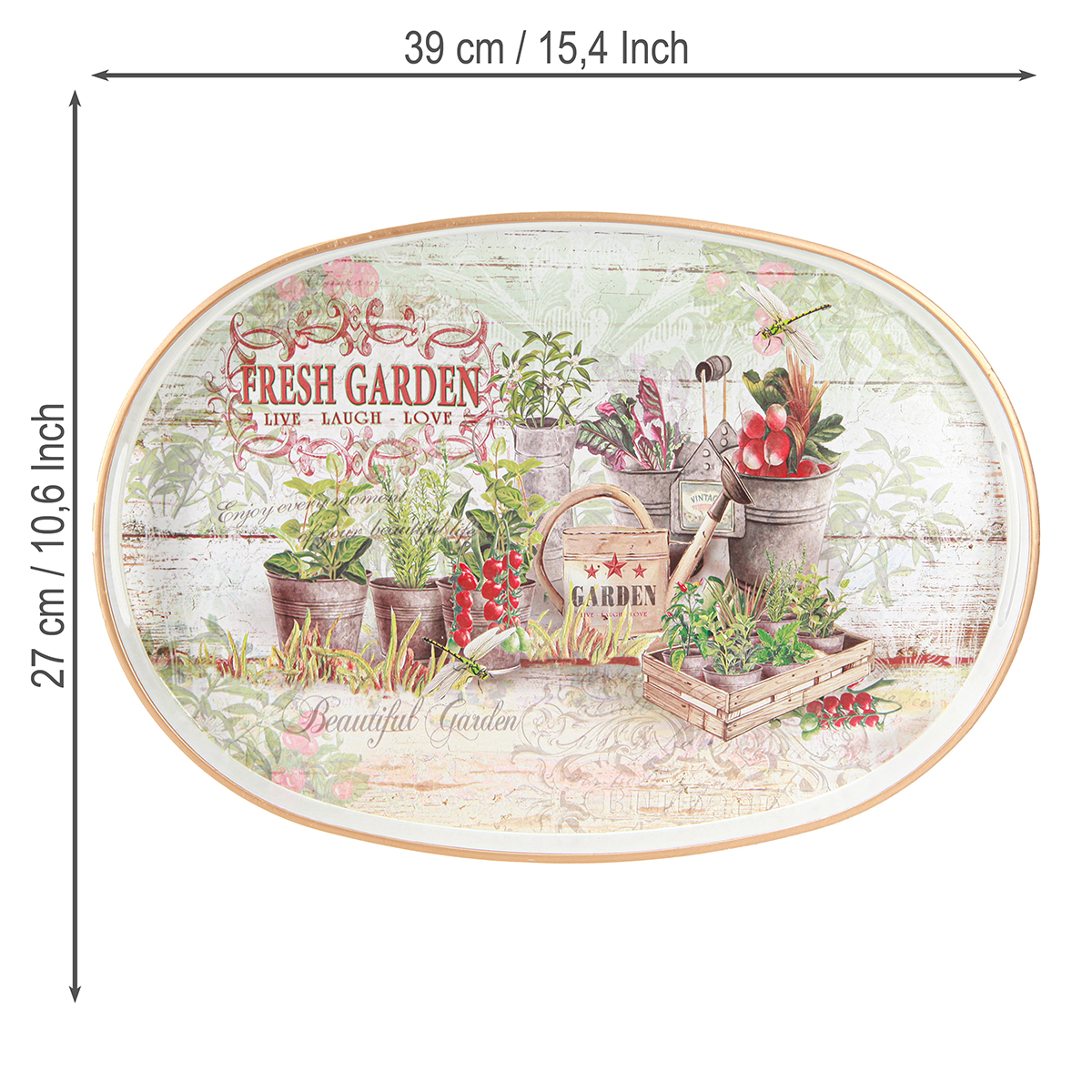 Entdecken Sie das zauberhafte ovale Tablett mit Griff im Fresh-Garden-Vintage-Design, das definitiv zum Blickfang in Ihrer sommerlichen Tischdekoration wird. Mit seinen Maßen von etwa 39cm × 27cm × 3,5cm bietet dieses dekorative Schmuckstück aus weißem Kunststoff mit goldenem Rand genau die richtige Größe, um Snacks und kalte Getränke stilvoll zu präsentieren. Das auf dem Boden des Tabletts abgebildete Gartenmotiv fasziniert mit einer idyllischen Szene aus einer Gartenhaus-Wand mit Pflanzkübeln, Kräutertöpfen sowie schwebenden Libellen. Der nostalgische Schriftzug "Fresh Garden – Live – Laugh – Love" verleiht dem Tablett einen besonders charmanten Vintage-Touch. Ganz gleich, ob Sie eine Gartenparty planen oder ein gemütliches Treffen im Garten genießen möchten, dieses ovale Tablett mit Griff ist das ideale Serviertablett oder Deko-Tablett und wird Ihre Gäste verzaubern.
