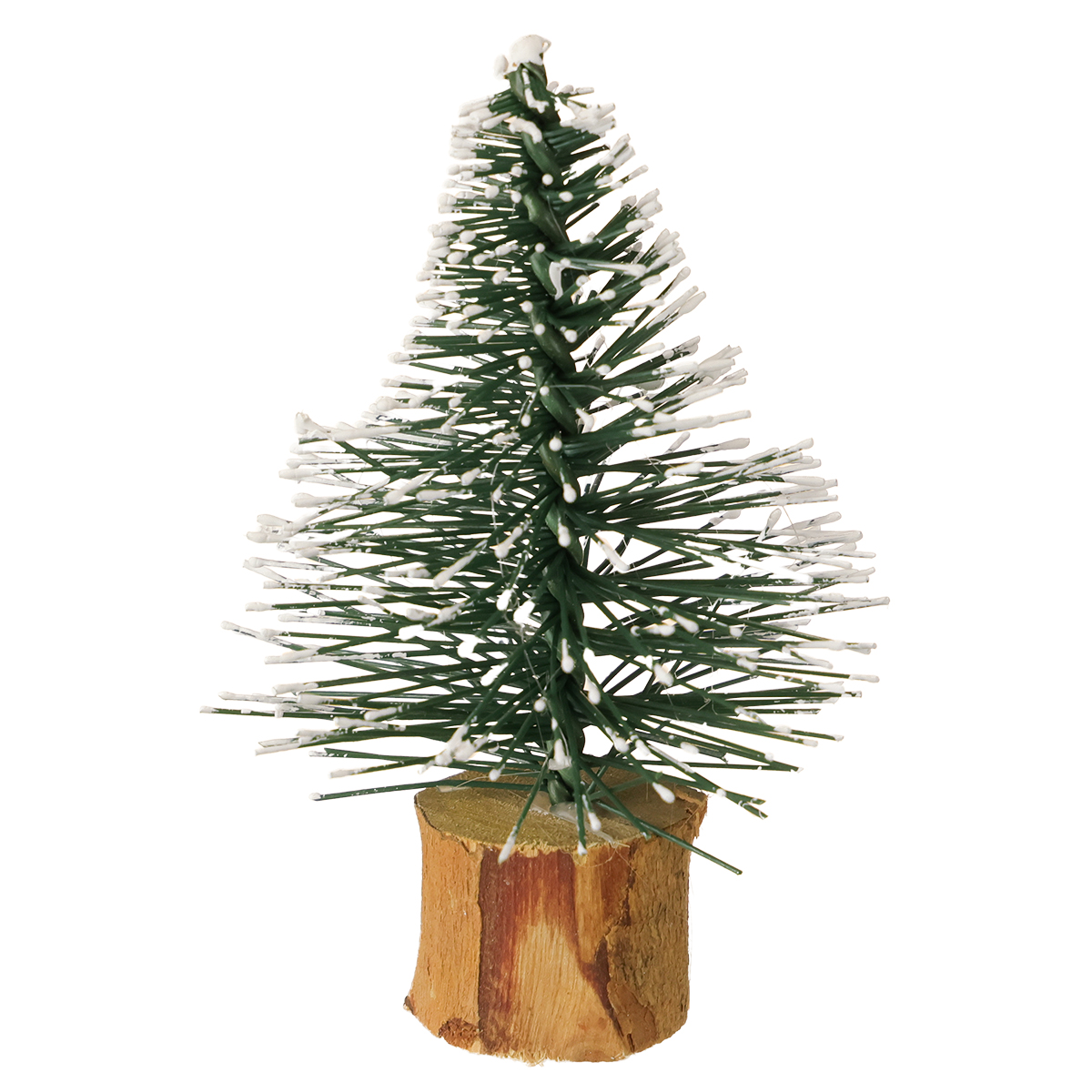Non seulement la neige artificielle sur les mini sapins offre un beau contraste avec le vert sapin des branches, mais aussi la base en bois naturel.