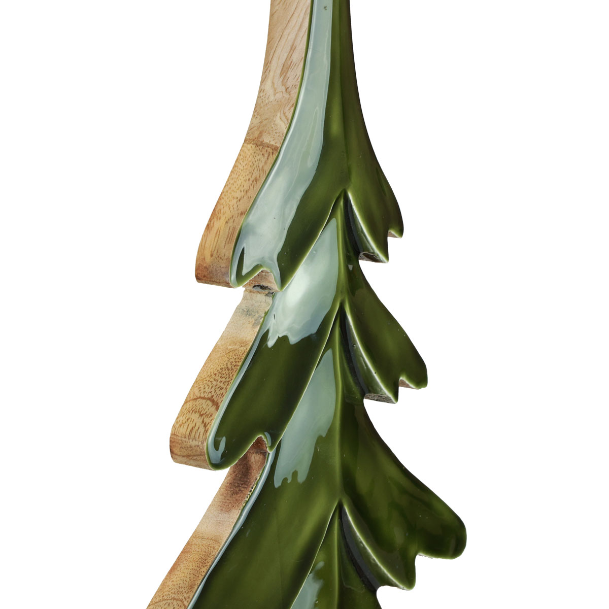 Eine wenige Millimeter dicke Lackschicht bedeckt die Holz-Deko. Die grüne Farbe schimmert dabei dezent je nach Lichteinfall in hellerem und dunklerem Grün. Die Enden der Tannenbaum-Deko sind rund gestaltet, was die ganze Weihnachtsdeko umso freundlicher wirken lässt.