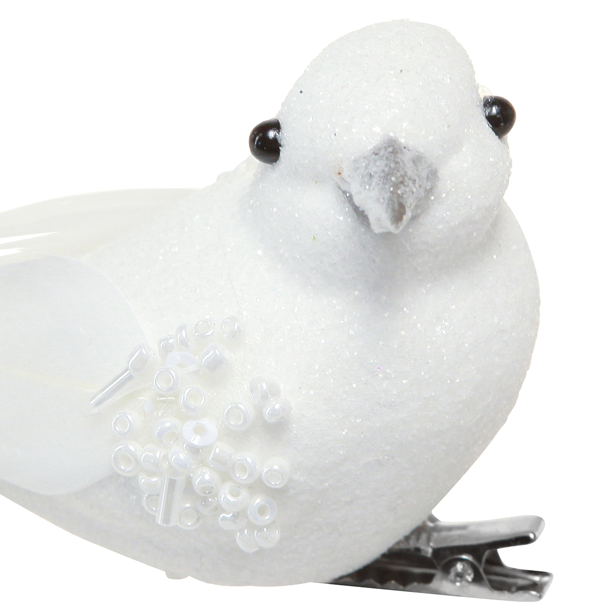 Das Taubenpaar am Clip besitzt eine Länge von etwa 22 Zentimetern und ein Höhe von circa 8 Zentimetern. Die Körper sind in einem eleganten Weiß gehalten, das zusätzlich noch durch silbernen Glitter zum Funkeln gebracht wird. Die Schwanzfedern und die Flügel bestehen aus echten, weißen Federn, die zum Teil noch mit Perlen in Perlmutt geschmückt sind.