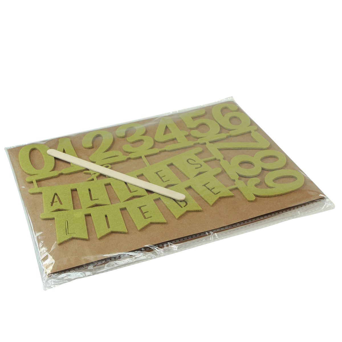 Beides kommt als DIY-Set aus zwei Farben, jeweils einmal als Filz-Platte in Grün und einmal in Grau. Im Set enthalten sind zwei Holzspatel, welche Sie als Stecker für die Kuchentopper nutzen können.