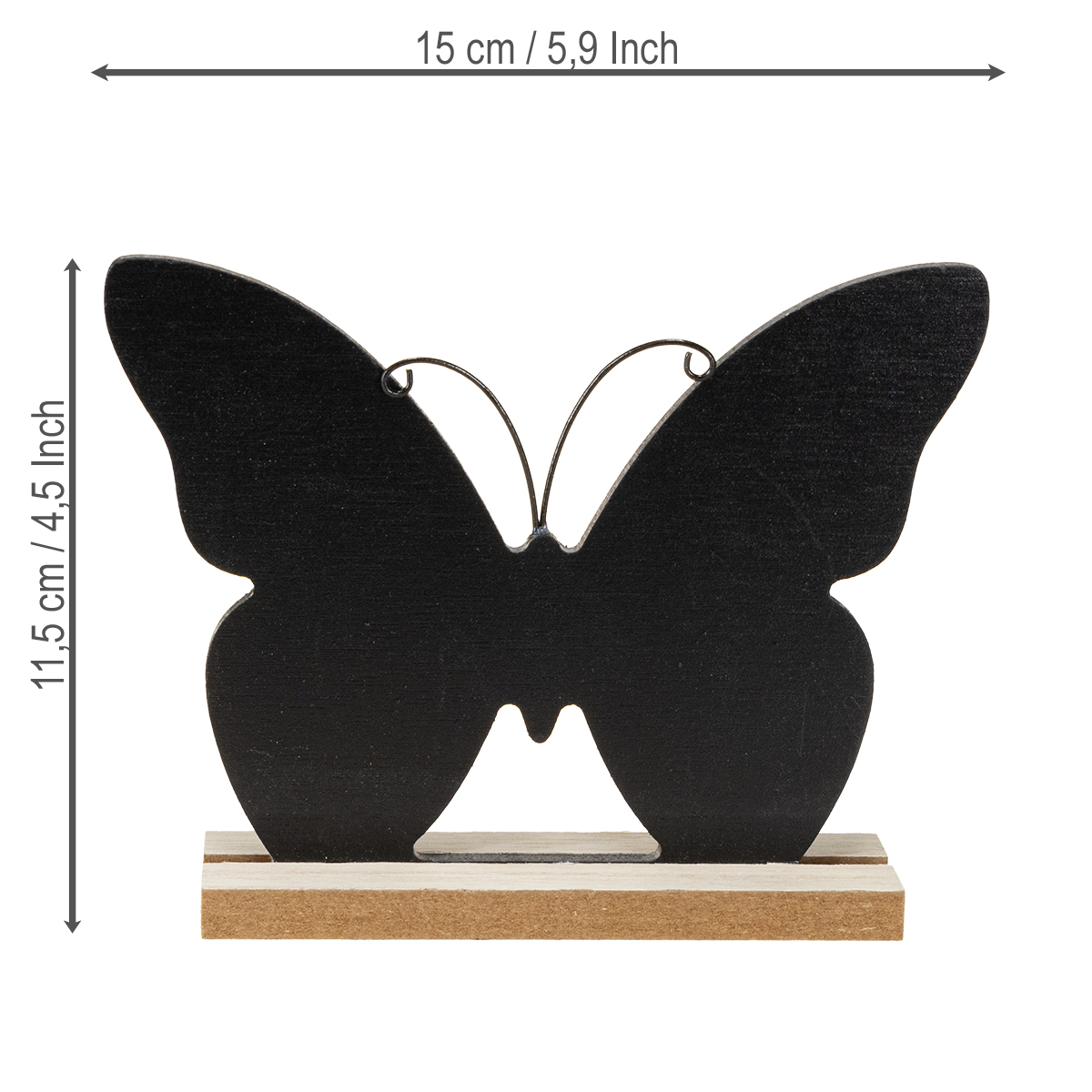 Ergänzt wird der schwarze Schmetterling durch seine zarten Fühler aus ebenso schwarzem Metall. Der Schmetterling steht in einer schmalen Einkerbung inmitten seines Sockels aus Holz und ist dort stabil befestigt.