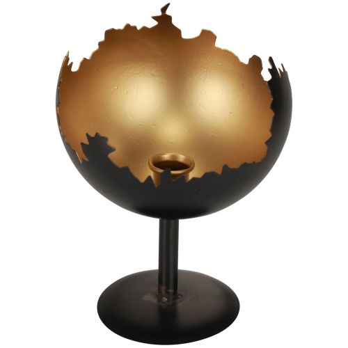 Dieser Kerzenhalter aus Metall kommt in Form einer kunstvollen Lichtschale in Gold und Schwarz, die sich als Tischdeko zu Weihnachten ganz wunderbar macht.