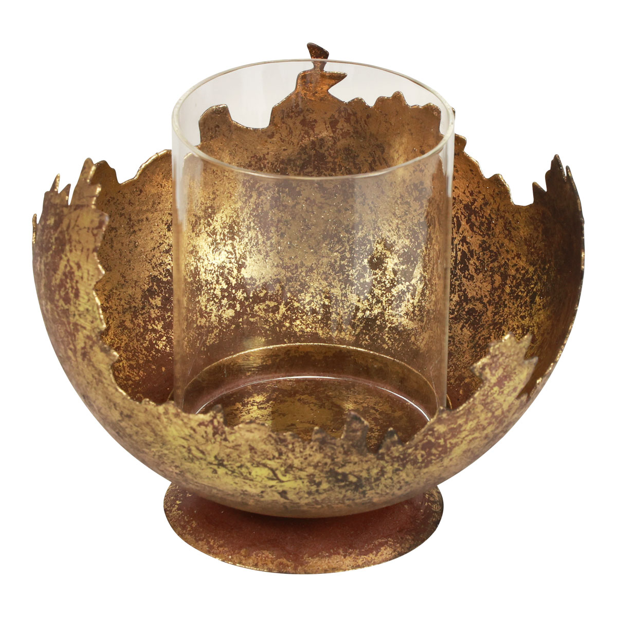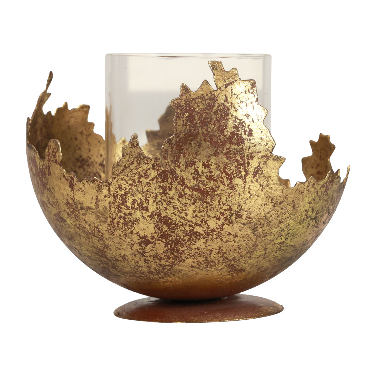 Diese Lichtschale aus Metall kommt als Windlicht mit herausnehmbarem Glaszylinder. Als Tischdeko zu Weihnachten macht sich die schwarz-rotbraune Halbschale mit ansprechend eierschalenartigem Bruch an den Kanten in unterschiedlicher Höhe und blattgoldartiger Patina ganz besonders schön!Die Tischdeko aus Metall hat einen runden Standfuß, mit dem der Kerzenhalter stabil und sicher in der Tafeldeko steht. Innerhalb des Glaszylinders haben Teelichter als auch Stumpenkerzen bis zu einem Durchmesser von etwa 7 Zentimetern und einer Höhe von um die 10 Zentimetern Platz.