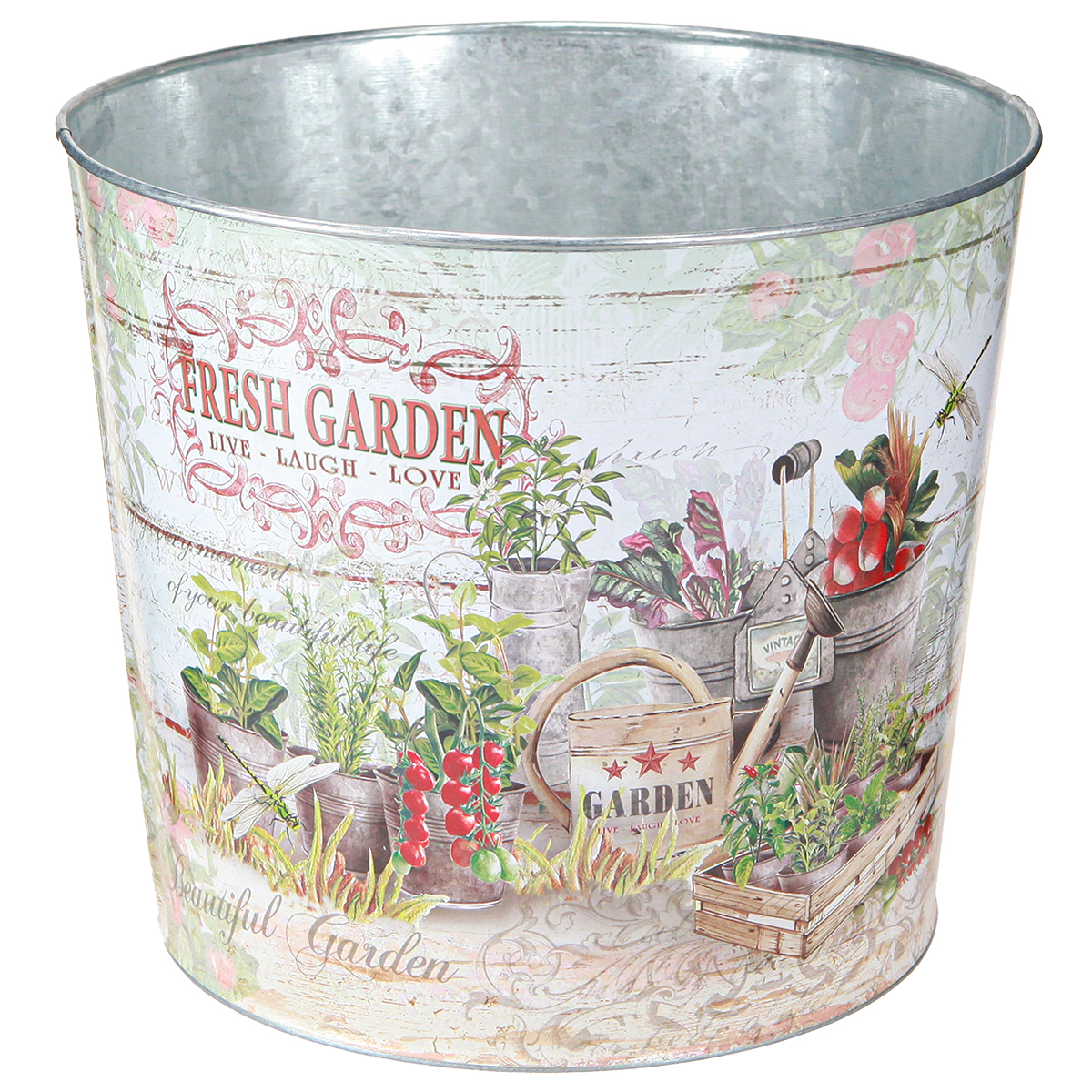 Erleben Sie in diesem Frühjahr bunte Frische mit unserem runden Pflanzkübel aus Metall. Dieser dekorative Blumenkübel ist ideal für Hobbygärtner und Dekorationsliebhaber, die ihren Balkon, die Terrasse oder die Fensterbank in ein kleines Blumenparadies verwandeln wollen. Die robuste Metallkonstruktion vereint Langlebigkeit mit einem lebhaften, farbenfrohen Design, das jedem Raum eine frische Atmosphäre verleiht. Mit einer kompakten Höhe von etwa 21 cm ist dieser Blumenkübel perfekt für kleine Pflanzen oder Kräuter geeignet und bringt einen Hauch von Frühling und Sommer in Ihr Zuhause. Das stilvolle Motiv, das von einer Gartenhaus-Wand voller Werkzeuge, schwebender Libellen und dem inspirierenden Schriftzug "Fresh Garden – Live – Laugh – Love" geprägt ist, vermittelt eine romantische Vintage-Ästhetik. Harmonisch anpassungsfähig, lässt sich dieser Kübel sowohl mit klassischem als auch mit ländlich geprägtem Stil kombinieren und wird schnell zum Highlight Ihrer Tischdeko im Frühling und im Sommer. Entdecken Sie die vielseitigen Einsatzmöglichkeiten und kombinieren Sie diesen Kübel mit weiteren frischen Gartenelementen für ein stilvolles Gesamtbild.