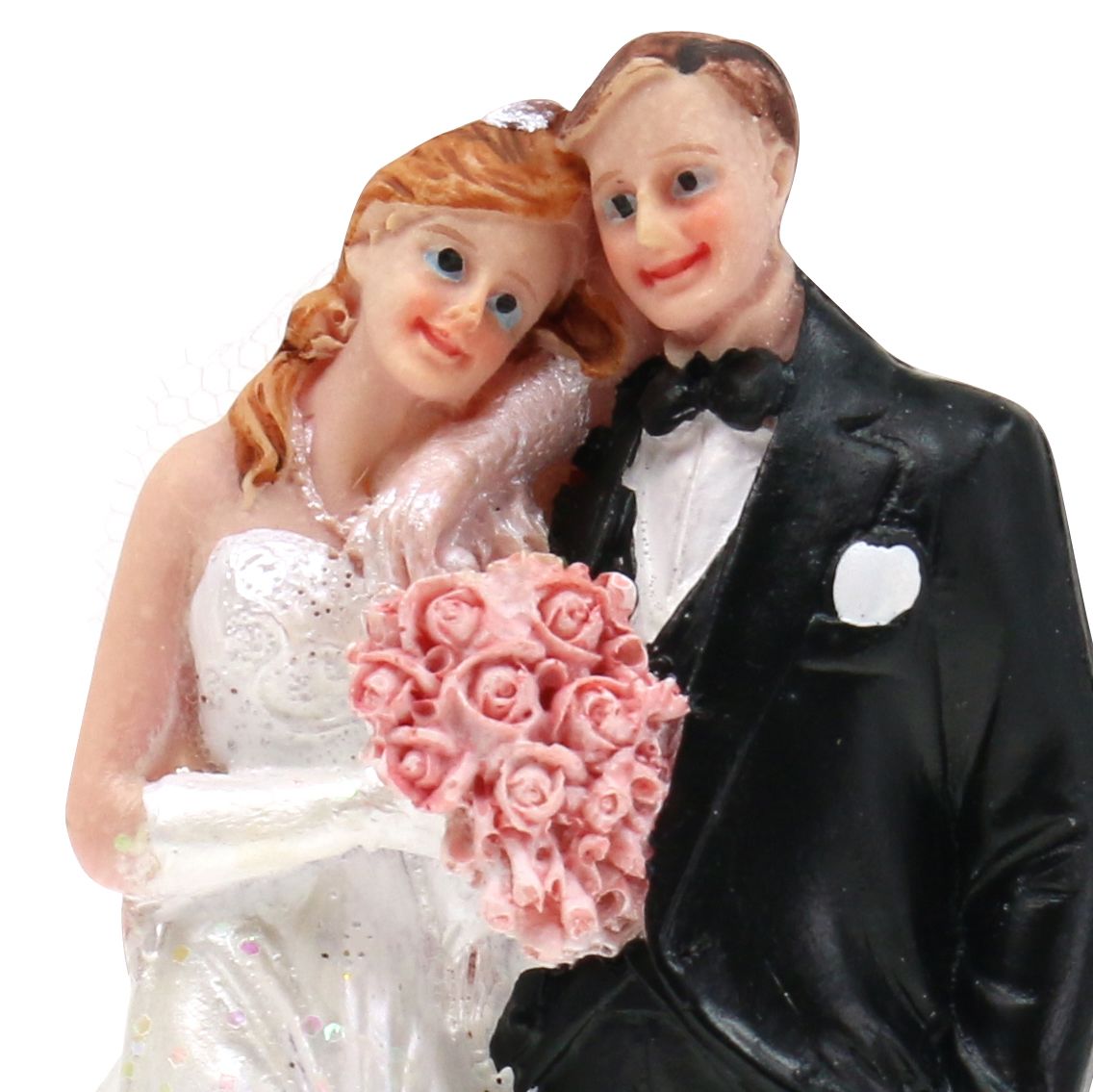 Trasforma la tua torta in un vero sogno ed evidenzia con questa figurina per torta! Un matrimonio è vero, profondo amore e connessione e dovrebbe indugiare in un ricordo eterno e positivo con gli sposi e gli ospiti. Gli sposi sono realizzati in poliresina di alta qualità e progettati con cura con molti dettagli. La sposa era vestita magnificamente e si pensava di tutto, dai veli alle collane di perle e ai bouquet da sposa. L'abito da sposa è anche coperto con particelle di glitter rosa, che forniscono la dose extra di glamour. La sua testa è posata intimamente sulla spalla di suo marito, che è anche festosamente vestito con una ghirlanda nuziale.