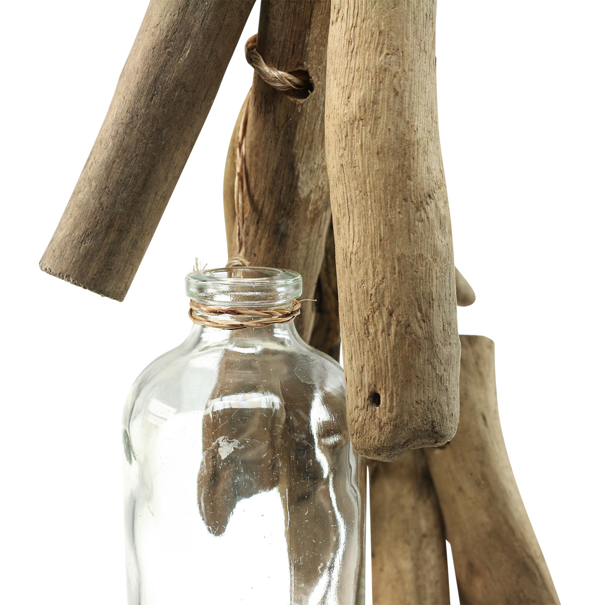 Matière : bois flotté, corde naturelle, verre