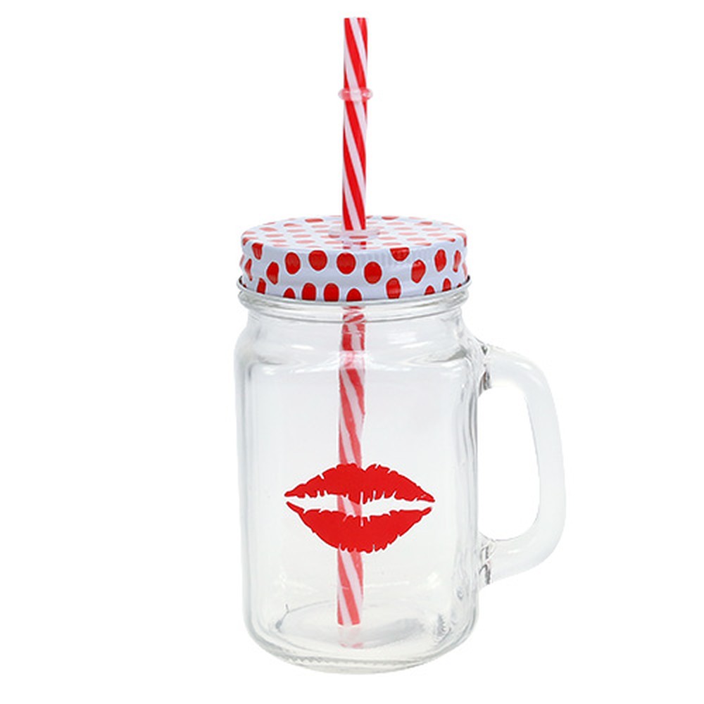 Notre verre carré est illustré d'une bouche rouge et muni d'un couvercle métallique à visser avec des points et un trou par lequel on peut passer la paille fournie. Celle-ci est en plastique robuste et mesure environ 19 cm. Le verre lui-même a une taille de près de 13,5 cm et un diamètre d'ouverture de 7 cm à peu près. Attention : ce verre n’est pas adapté à un lavage en lave-vaisselle.