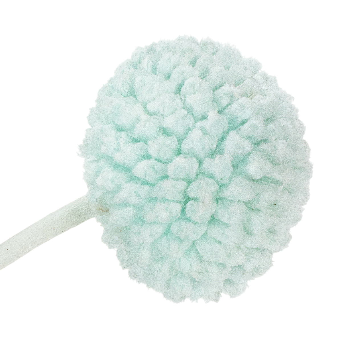 Les fleurs de Craspedia, d'un diamètre de deux à trois centimètres environ, forment un magnifique centre de table. Leurs tiges aux teintes naturelles contrastent avec le bleu menthe éclatant. Ce bouquet est particulièrement décoratif dans des vases minimalistes ou intégré à une composition plus importante de fleurs séchées. On peut l'associer, par exemple, à des herbes de la pampa ou à de l'eucalyptus pour un style aérien et moderne.