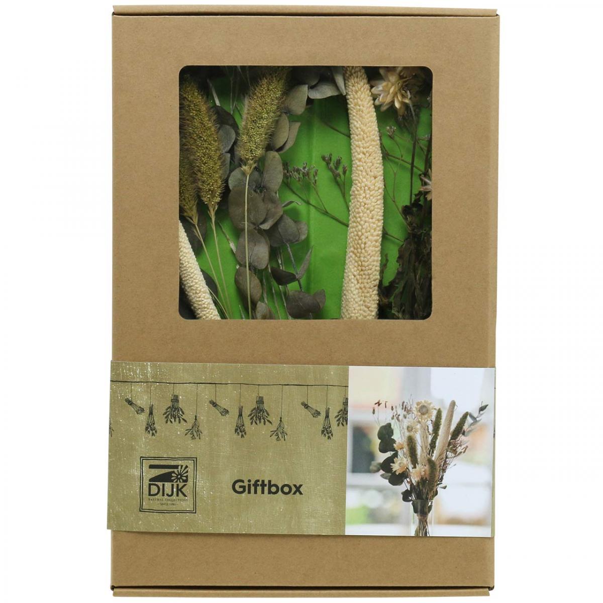 Der Trockenblumen-Strauß mit Eukalyptus ist getrocknete Naturdeko vom Feinsten: Details wie die cremefarbenen Hirsekolben als helle Hingucker verraten auf Anhieb, dass dieses Trockenfloristik-Set von Kennern für Kenner zusammengestellt wurde. Die fachmännisch getrockneten Strohblumen und Eukalyptuszweige können bis zu ein Jahr lang Ihr Heim verschönern – vorausgesetzt, Sie setzen die Trockendeko weder Feuchtigkeit noch direktem Sonnenlicht aus. Die attraktive Box aus Karton schützt die empfindlichen Trockenmaterialien auf dem Weg zu Ihnen, macht aus dem Trockenbouquet aber auch eine schöne Geschenk-Idee.Weil der Trockenstrauß nur eine kleine Vase und kaum Platz braucht, müssen Sie auf hochwertige Naturdeko sogar in einer kleineren Stadtwohnung nicht verzichten. Schmücken Sie den Esstisch, einen Beistelltisch oder einen Couchtisch mit abwechslungsreicher Trockenfloristik. Für ein Sträußchen, können Sie die Trockenblumen und Gräser nach Ihrem Geschmack arrangieren. Eventuell binden Sie den Deko-Strauß noch mit einem rustikalen Band zusammen.
