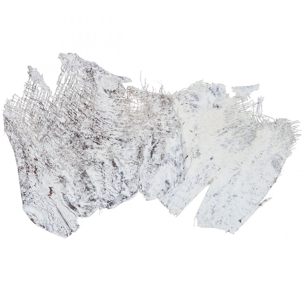 Längliche Palmfasern wurden übereinandergelegt, mit weißer Farbe bestrichen und anschließend getrocknet. Entstanden sind durch diesen Prozess blätterartige Formen mit ästhetischer Fransen-Optik.