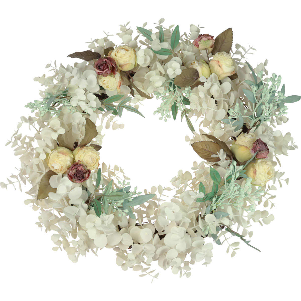 La couronne d'eucalyptus et de roses artificielles a un diamètre total d'environ 50 centimètres. – Vous trouverez également dans notre large gamme d'autres couronnes artificielles dans d'autres designs ainsi que des couronnes avec des feuilles d'eucalyptus stabilisées !
