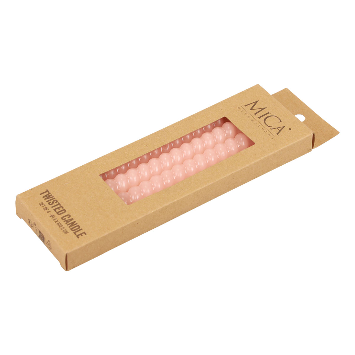 Le candele a spirale sono disponibili in confezioni da 4 in rosa chiaro. Offriamo candele attorcigliate della stessa altezza e diametro in molti altri colori, come il rosso vino o il grigio senza tempo.