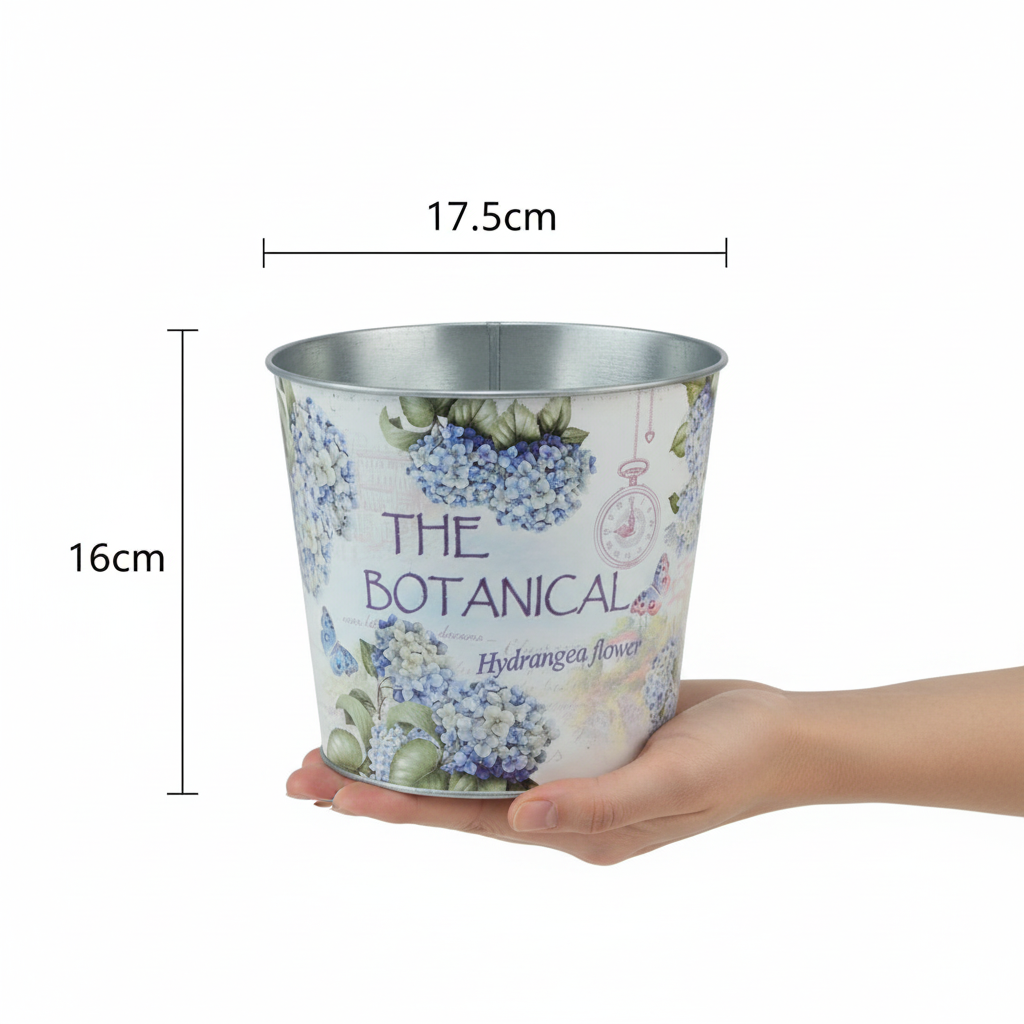 Ortensie blu e bianche fioriscono ovunque su questa stampa nostalgica, e farfalle svolazzano intorno a questa scena di giardino. Il vaso, inoltre, ha la forma di un semplice secchio senza manici. L'interno del contenitore è zincato, ma a causa delle giunture non è impermeabile, quindi si consiglia di rivestire il vaso con della carta stagnola.