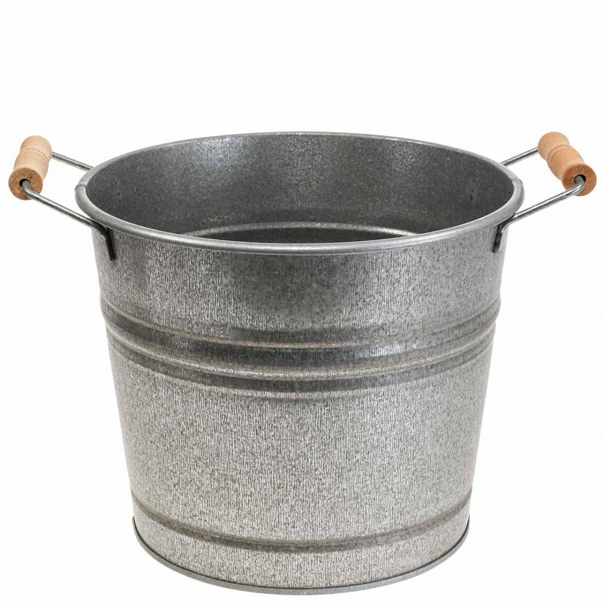 Le seau en métal est haut et rond et possède deux poignées en bois sur le bord. Grâce aux poignées, toute la plante peut être ramassée et déplacée facilement. La surface du métal n'est pas lisse et brillante, mais présente un motif intéressant de minuscules reliefs et de motifs dans différents dégradés de couleurs.