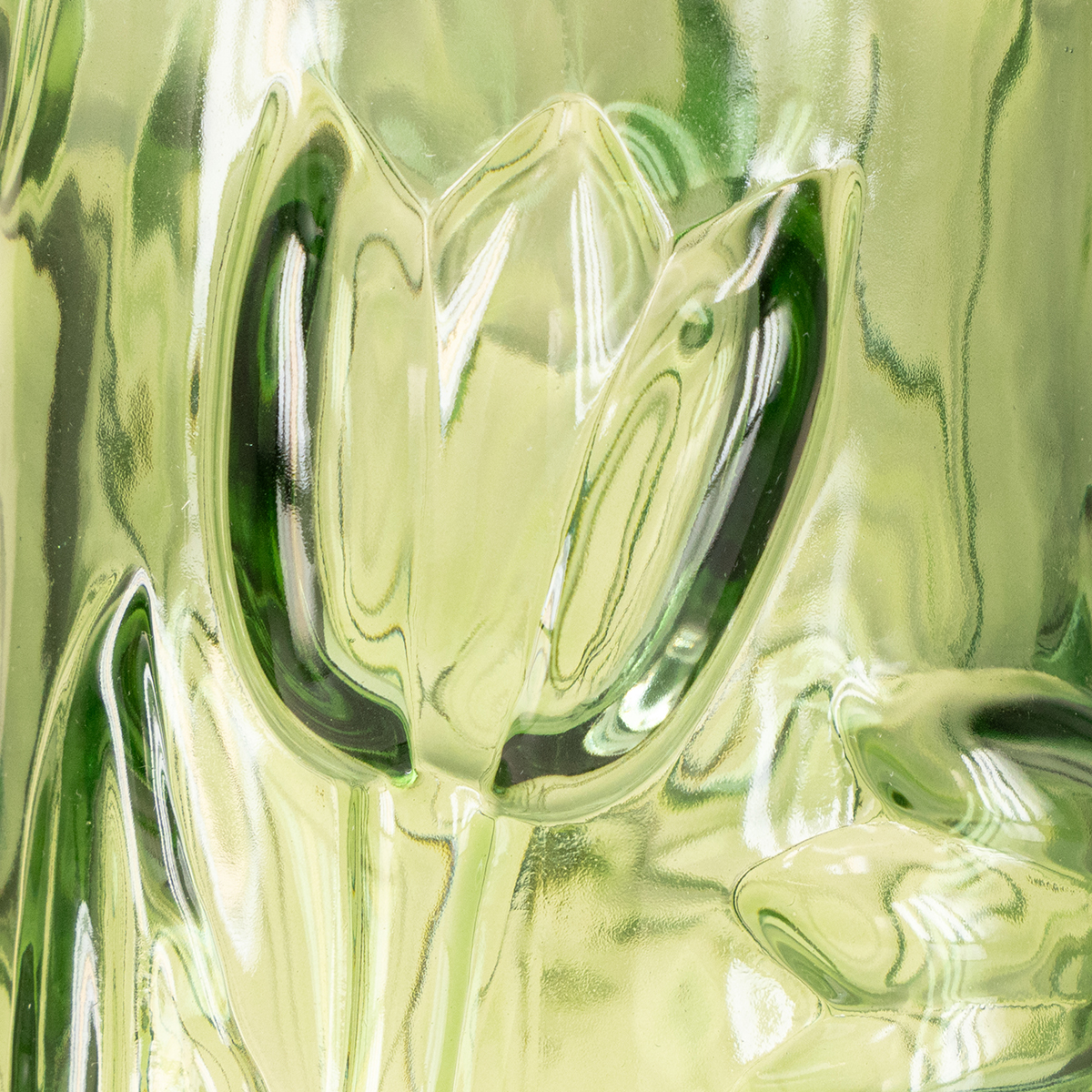 Die 30 cm hohe Glasvase in ihrem klaren, grünen Farbton besticht durch ihren zeitlos eleganten Charakter. Ihr einzigartiges Tulpenmuster bringt ein Stück Natur direkt in Ihre vier Wände. Die Kombination aus glänzendem Glas und dem sanften Grünton setzt dezente Farbakzente, ohne dabei aufdringlich zu wirken. Mit einem Durchmesser von 16 cm bietet die Vase ausreichend Platz für üppige Blumenarrangements, ohne überladen zu wirken.